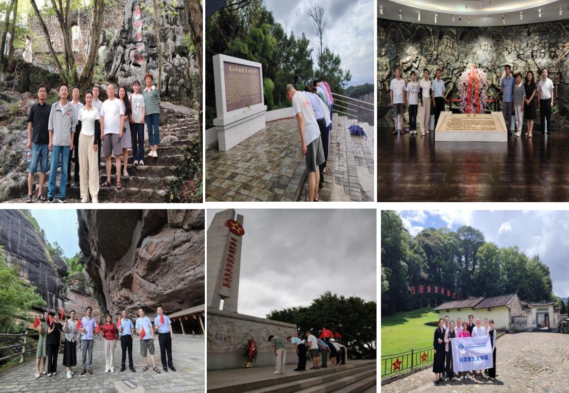 实践研学 在行走中知行合一 本次研学活动,我们也充分发挥了马克思主义学院专业优势,注重在行走中交流研讨,充分挖掘中央苏区红色资源,真正将调研走实、走深、走细。 前往长征第一山——云石山,以体验式教学的方式重走长征出发路,在追根溯源的过程中砥砺初心;顶着烈日冒着大雨,一路泥泞,一路崖壁盘旋,来到盘山阻击战烈士纪念碑深情瞻仰,向革命先烈致以崇高的敬意;赶往福建“古田会议”会址,回顾了古田会议召开前后的历史,重温思想建党、政治建军的基本原则;参观“中央革命根据地历史纪念园”,通过丰富的展览和雕塑,将革命历史生动地展现在世人面前;参观中央红军长征出发纪念碑、纪念园,学习苏区军民顾全大局、严守纪律、奋勇向前的革命精神;前往中央红军长征渡口旧址,立于渡口,倾听历史的回响,感受那段红军开启长征伟大征程的峥嵘岁月;前往罗汉岩参观汀瑞游击战旧址,追忆苏区军民在艰难环境中坚持开展游击战的斗争过程。
