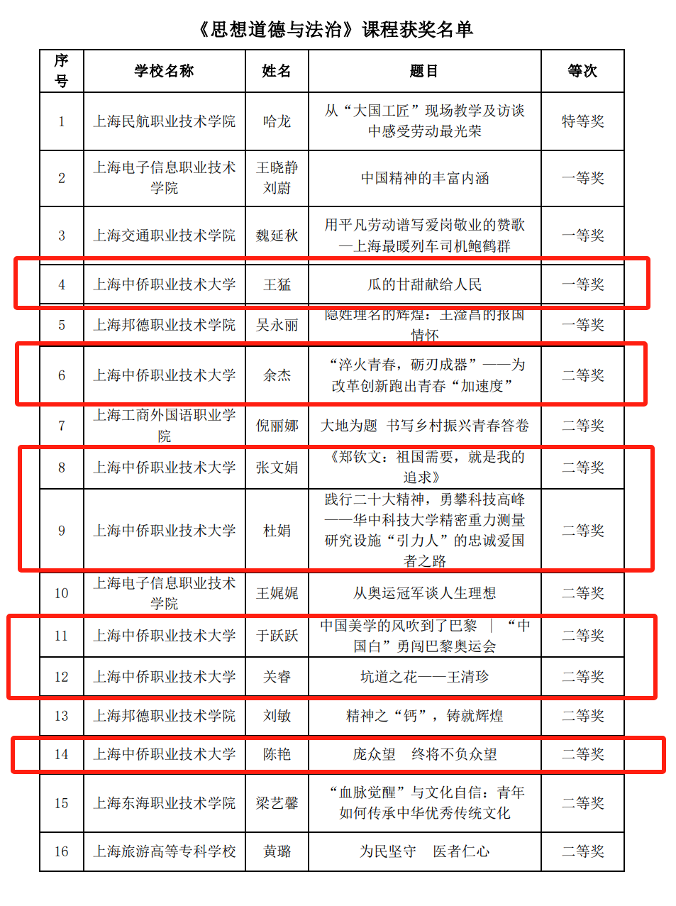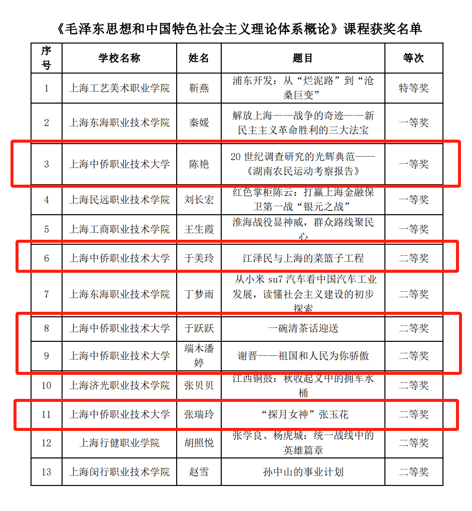 潜心教坛再创佳绩,丰收硕果再迎新年。近日,马克思主义学院在2024年上海市高职高专院校思想政治理论课教学案例设计竞赛、大学生讲思政课及微电影制作大赛中成绩斐然、捷报频传! 在2024年上海市高职高专院校思想政治理论课教学案例设计竞赛中,《习近平新时代中国特色社会主义思想概论》、《思想道德与法治》、《毛泽东思想和中国特色社会主义理论体系概论》三个课程的总奖项数目为39项,马克思主义学院获得的奖项总数为13项,喜获一等奖2项、二等奖11项,获奖数量在全市高职高专院校中名列前茅。这些成绩充分体现了马克思主义学院在思想政治教育教学改革中的突出成果,也彰显了马克思主义学院教师的教学能力、理论素养和创新意识。