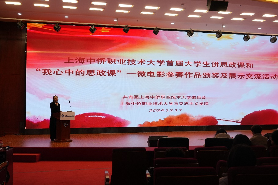 为深入贯彻落实全国教育大会精神,进一步学深悟透新时代学校思政课建设推进会精神,把习近平总书记关于学校思政课建设的重要论述及时转化为思政课守正创新、内涵式发展的具体行动,激发广大青年学生学思政课、讲思政课的积极性和主动性,引导学生深化对思政课的认识和理解,展现新时代大学生的马克思主义理论素养和精神风貌,2024年12月17日,上海中侨职业技术大学马克思主义学院开展首届大学生讲思政课和“我心中的思政课”——微电影参赛作品颁奖及展示交流活动。颁奖仪式由马克思主义青年教师付莹老师主持。
