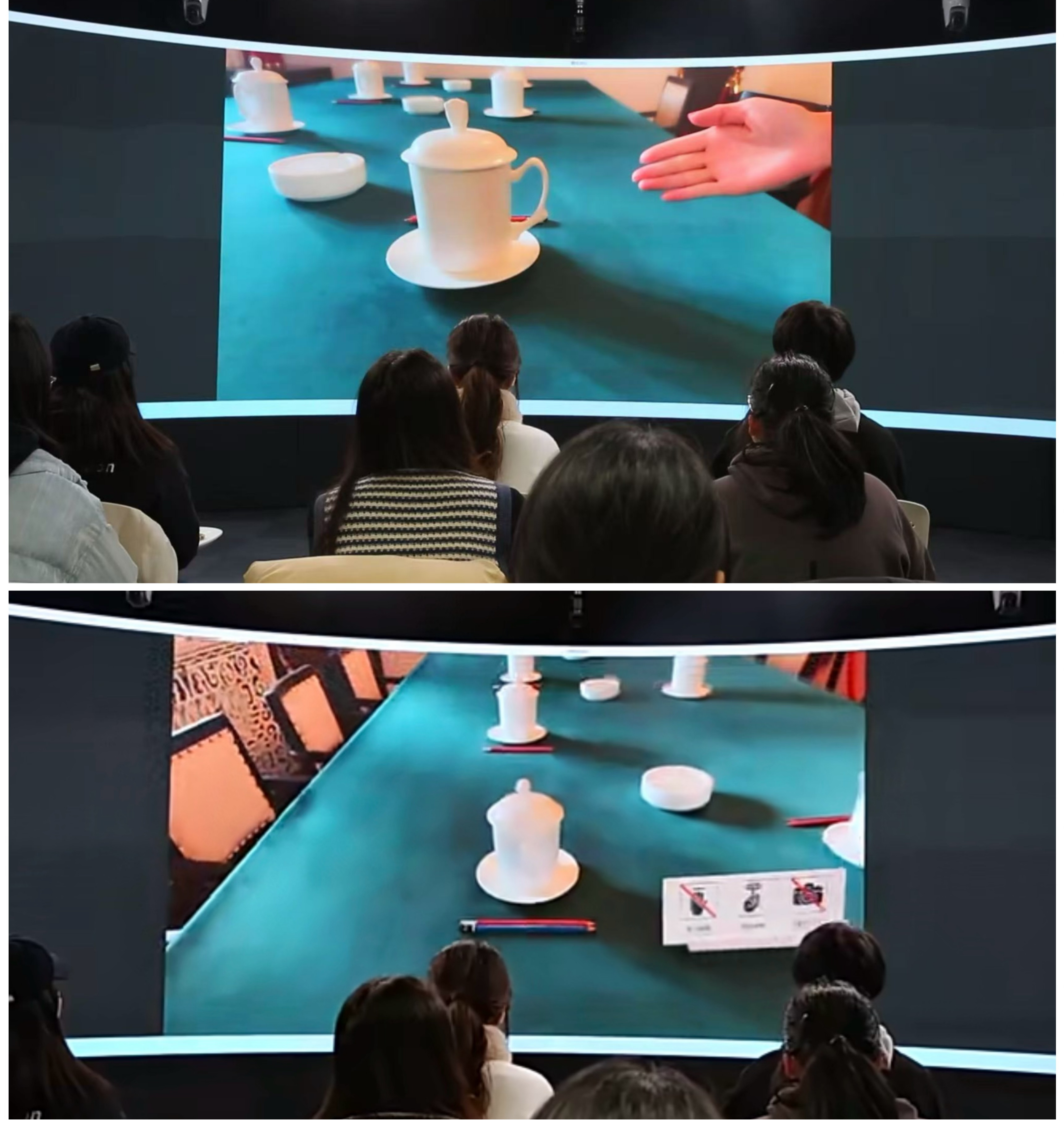 接着,视频连线到杭州“五四宪法”历史资料陈列馆,陈列馆的讲解员沈双汇为同学们深情地讲述那段关于宪法与杭州的不解之缘。随着线上讲解员的引导,同学们的思绪仿佛穿越到了杭州西子湖畔,置身于那座承载着新中国宪法起草历史记忆的陈列馆中。讲解员从“五四宪法”的起草背景、过程、意义,到宪法文本的形成、实施及影响,进行了详细而生动的介绍。过程中讲解员重点介绍了陈列馆会议桌上摆放着两件特殊物品:茶杯与铅笔。茶杯的名称叫“政权杯”,俗称“拳头杯”,是建国初期景德镇的工艺大师为新政权的诞生而创作的。“政权杯”的盖钮,是一个紧握的拳头,象征着广大人民群众欢庆革命胜利和团结一致建设一个新中国的坚定信念。“政权杯”的手柄,是镰刀和锤头连接在一起,象征着工农联盟是新政权的基础。铅笔为德国施德楼牌6B铅笔,颜色黑、笔芯软、书写流畅、字迹清晰,曾是毛主席喜爱之选,适合写大字。这种铅笔反映了新中国成立之初制造业基础薄弱,而新时代的中国既是制造业大国,更是制造业强国。通过一幅幅珍贵的历史照片、一件件真实的文物展品,陈列馆的讲解员为学生们呈现了一幅生动的宪法历史画卷。