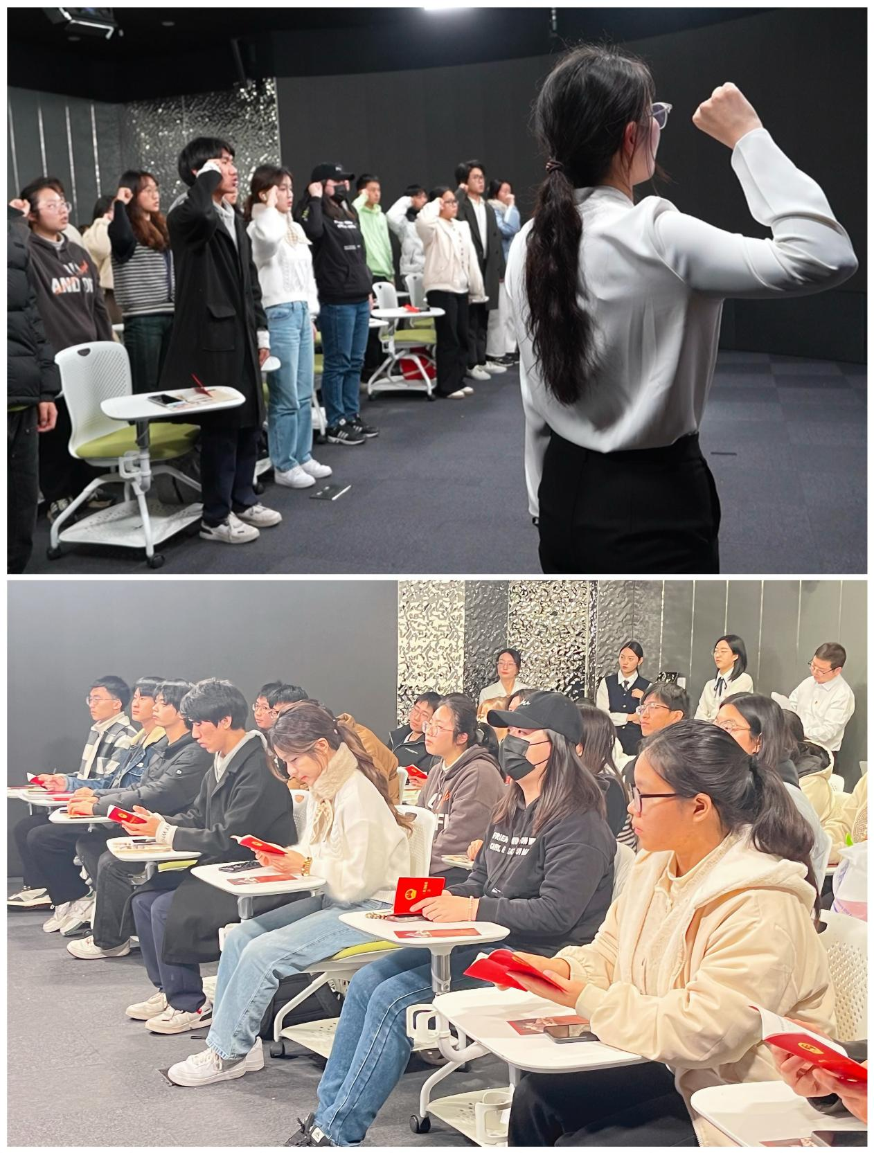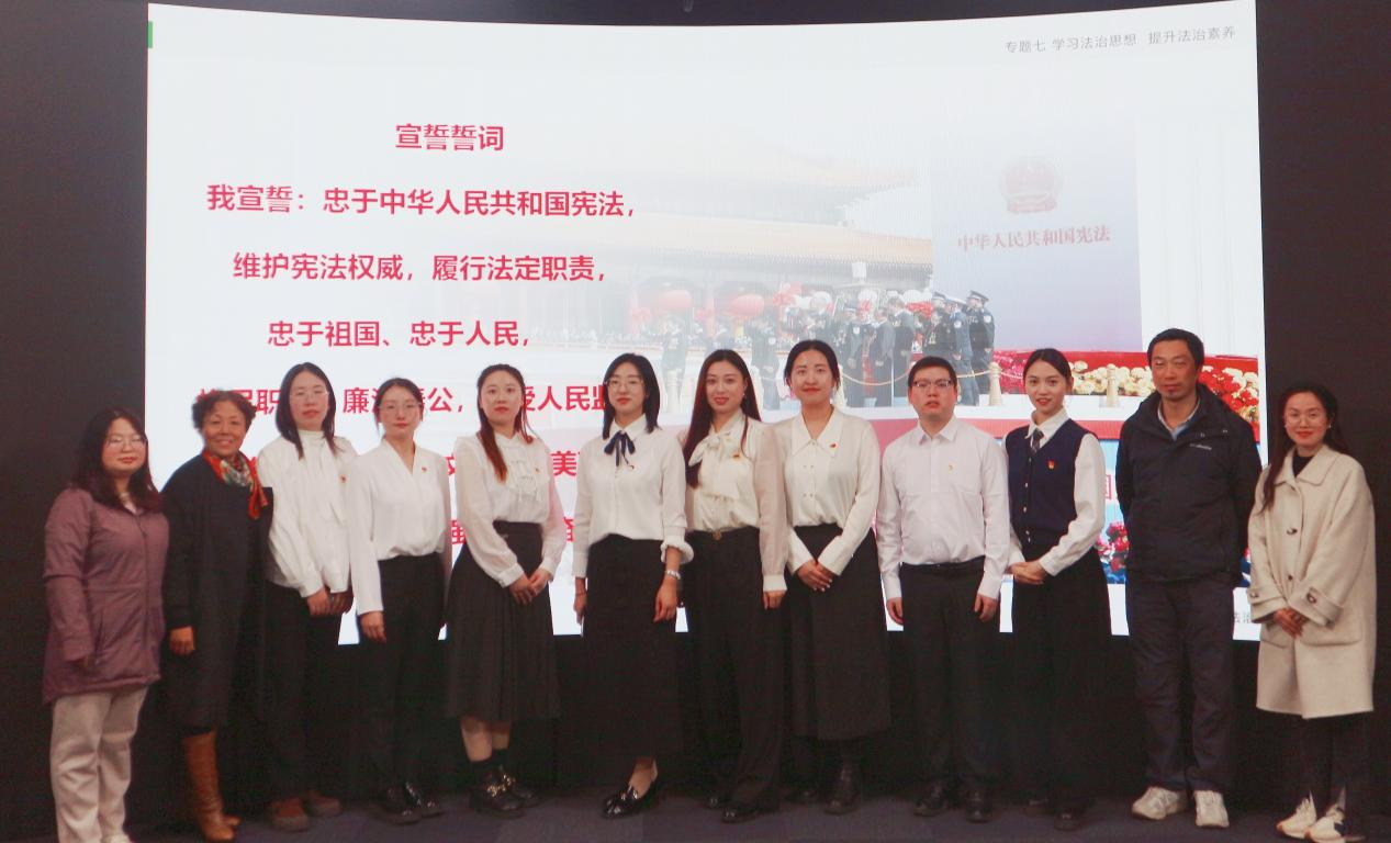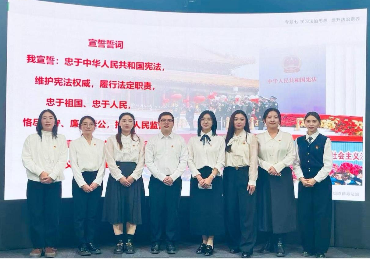 最后,王建枝老师梳理了党的十八大以来,以习近平同志为核心的党中央在宪法理论与实践、宪法制度建设及宪法实施领域取得的历史性成就。她引用了习近平总书记的深刻论断“宪法的生命在于实施,宪法的权威也在于实施”这句话,谈到宪法的权威和实施根源于人民的真心拥护和坚定信仰。随后,王老师引领学生进行了一场庄严的中国宪法宣誓仪式,值此契机,她鼓励并号召同学们积极弘扬宪法精神,将宪法精神内植于心,外践于行,在中国现代化建设的伟大征程中,以实际行动贡献法治力量,彰显青年担当。