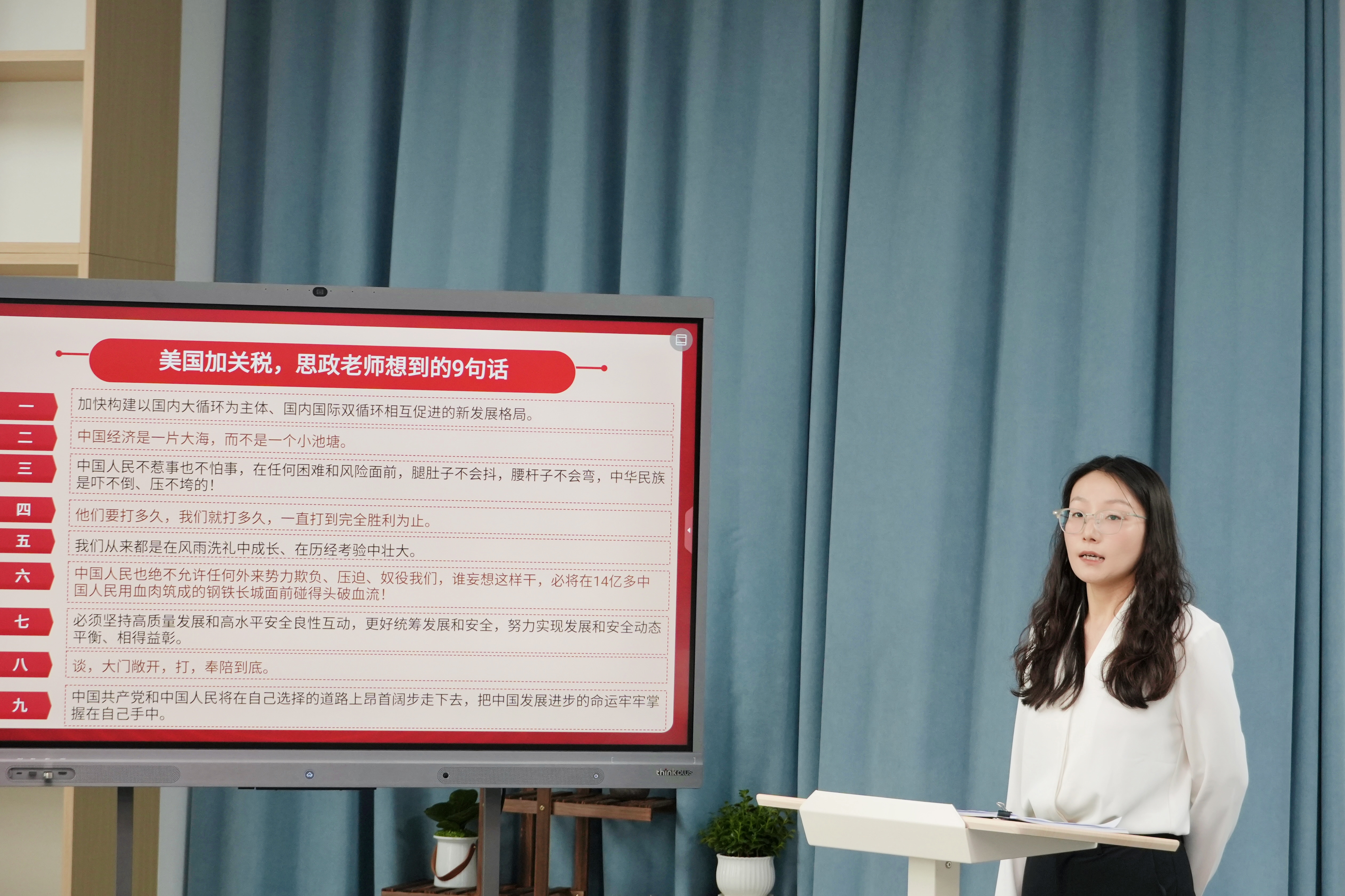 在结合时政热点讨论时,封书记强调高校教师应站稳政治立场,将理论学习转化为育人实效。针对美国加征关税的事件,王建枝老师带领大家深入思考国家在经济、关税政策方面的重要讲话。