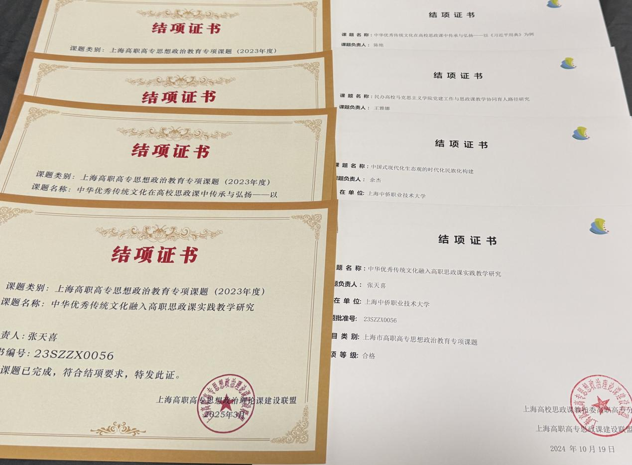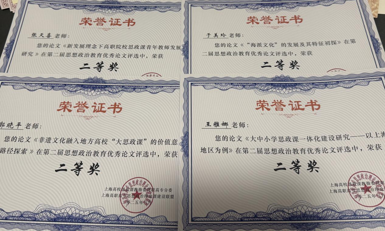 张天喜老师、郭晓平老师、于美玲老师、王雅娜老师在第二届思想政治教育优秀论文评选中荣获二等奖共4项。同时张天喜老师、陈艳老师、王雅娜老师、余杰老师2023年度上海市高职高专思想政治教育专项课题顺利结题并发放结项证书共4项。