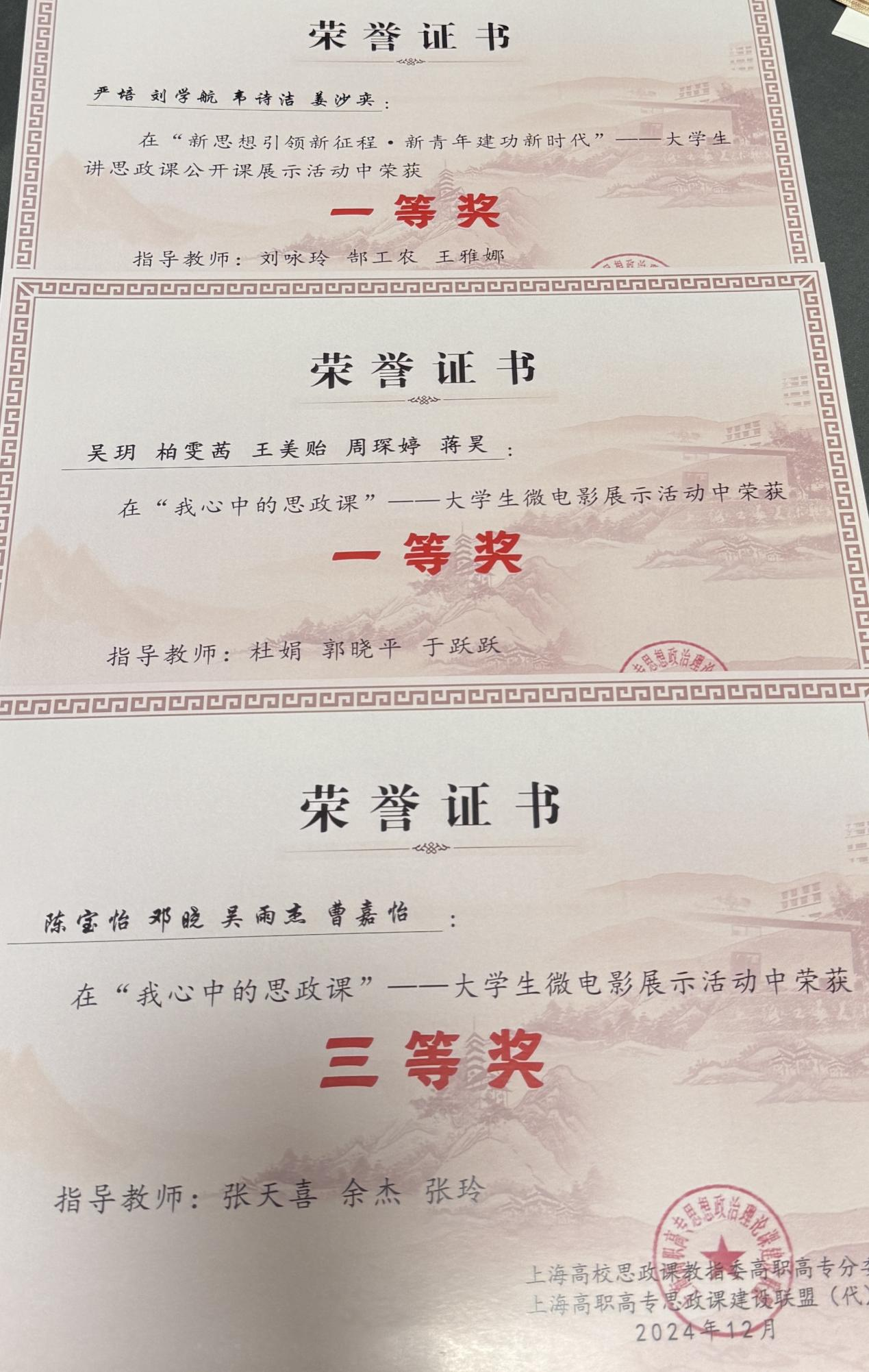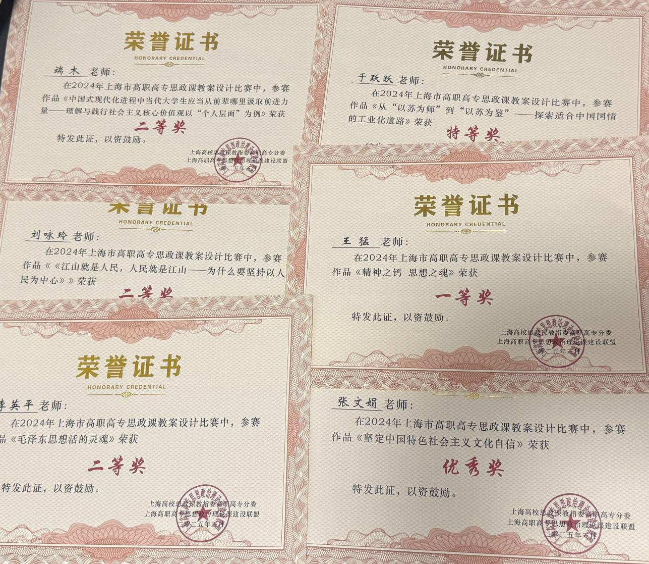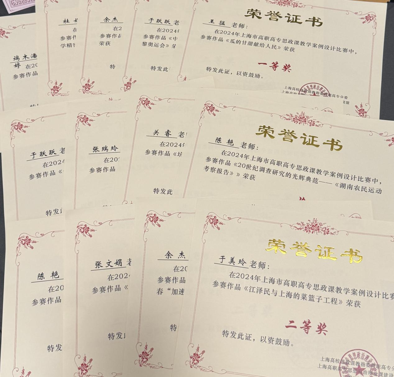 王猛老师、陈艳老师、关睿老师、于美玲老师、于跃跃老师、余杰老师、端木潘婷老师、张瑞玲老师、张文娟老师、杜娟老师分别荣获2024年上海市高职高专思政课教学案例设计比赛一、二等奖共13项。