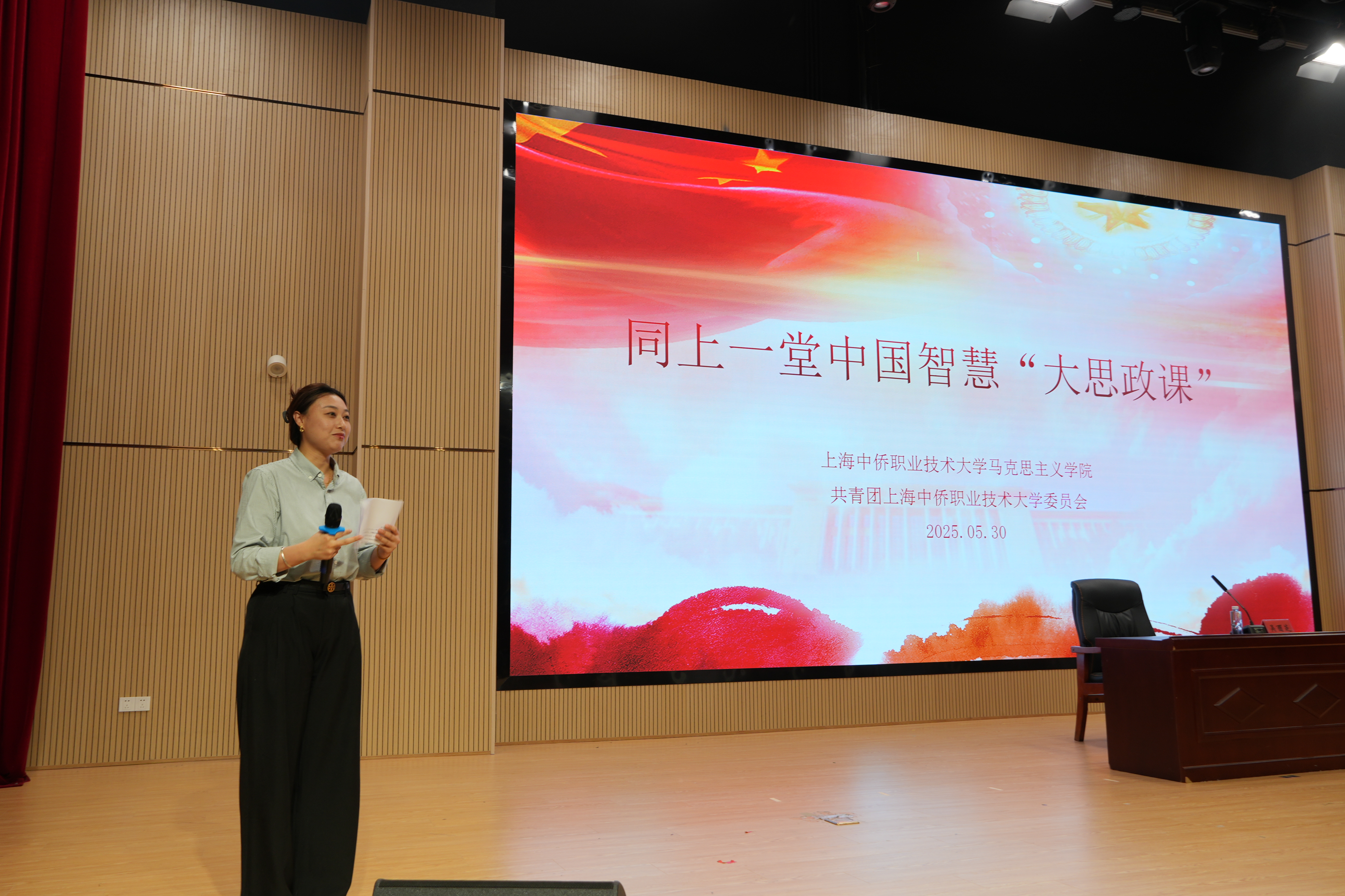 为深入学习贯彻全国教育大会精神,全面落实习近平总书记关于“大思政课”建设的重要指示批示精神,提升高校师生思想政治素养,5月30日,上海中侨职业技术大学马克思主义学院联合校团委举办了同上一堂中国智慧“大思政课”活动。本次活动特邀上海中侨职业技术大学副校长吴酉芝、上海浦东软件园股份有限公司副总经理戴月明担任主讲,中侨大学团委副书记、马克思主义学院青年教师于跃跃主持,马克思主义学院全体教师与300余名学生齐聚一堂,共探传统智慧当代价值与经济博弈深层逻辑。