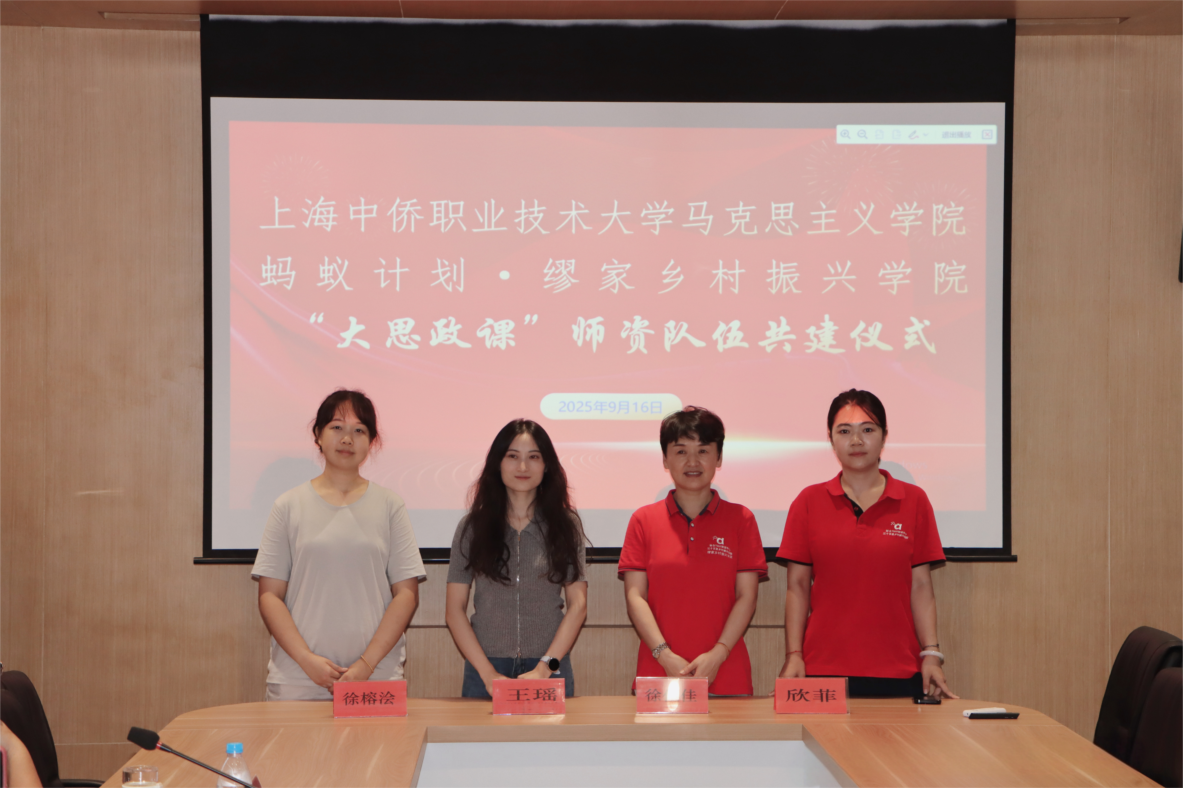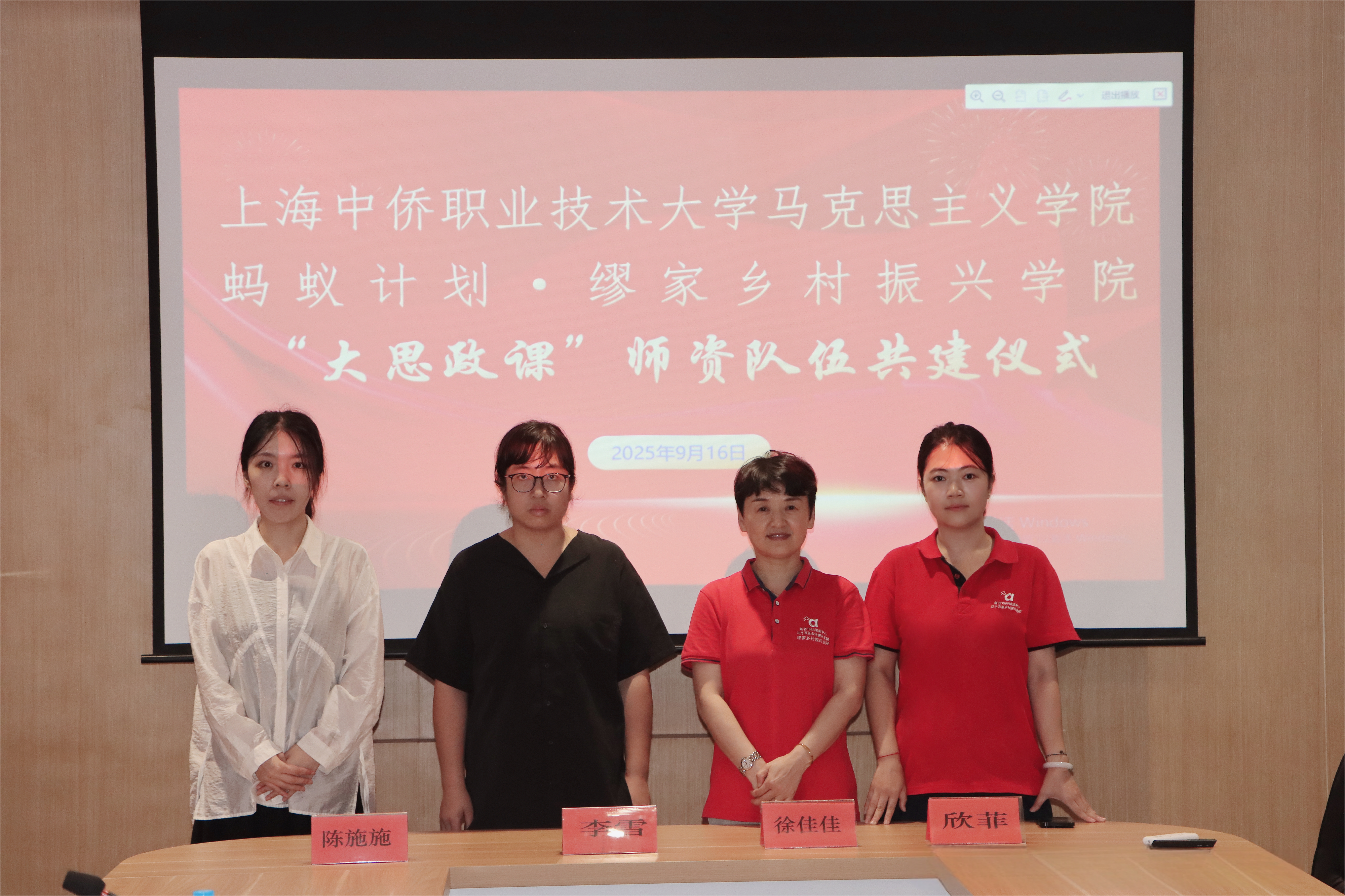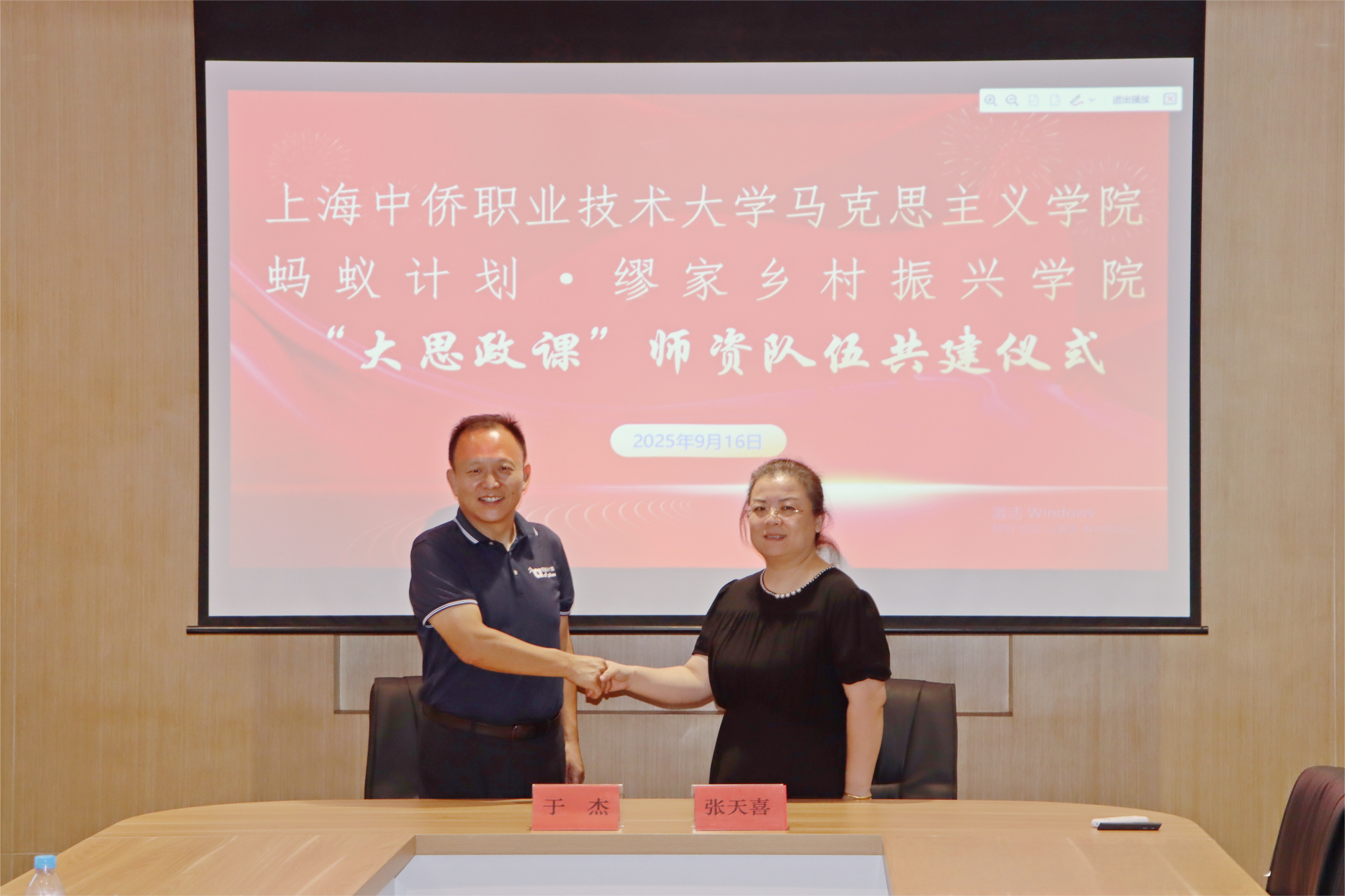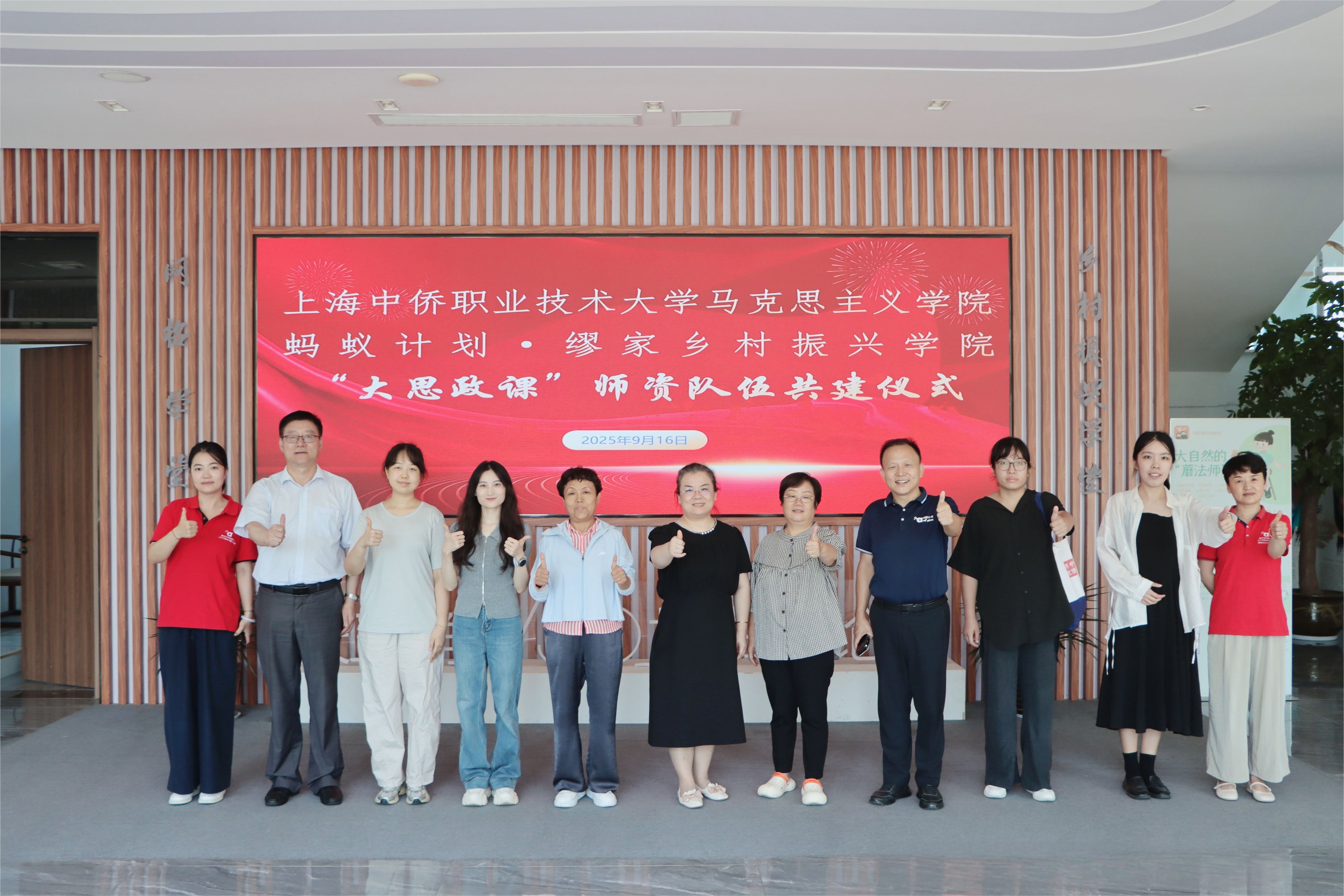 紧接着,在乡村振兴学院举行了“大思政课”师资队伍共建仪式。马克思主义学院与缪家乡村振兴学院正式签署合作协议,共同建立“大思政课”实践教学基地与师资共建平台。双方将围绕乡村振兴实践案例开发、双师型教师培养、实践教学资源建设等方面开展深度合作,让鲜活的实践案例走进课堂,让思政教师扎根大地做研究,共同打造接地气、有温度、有深度的思政金课。