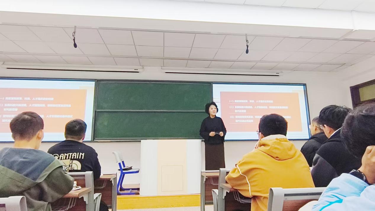 刘淑芸副校长以 “社会主义现代化建设的教育、科技、人才战略 —— 教育强国背景下,中侨教育跃升和大学生的成才之路” 为题,从为什么要坚持教育、科技、人才一体推进、怎样加快建设教育强国、怎样加快建设科技强国、如何深入实施新时代人才强国战略,带领同学们深刻认识三者协同发展的战略意义与实践路径。课堂上,她结合中侨大学从专科院校到本科层次职业大学的跃升历程,生动阐释了职业教育在贯通教育链、人才链、产业链中的独特作用,并用学校产教融合、校企合作的鲜活案例,引导同学们立足专业找准定位,将个人成长融入国家现代化建设大局。