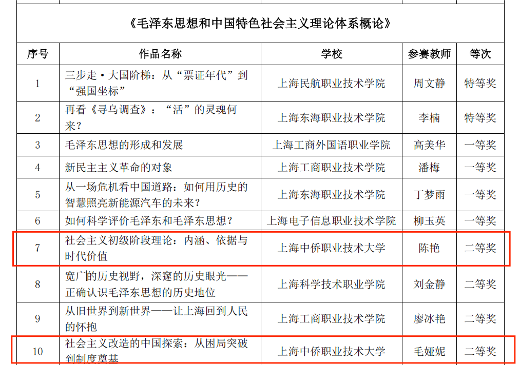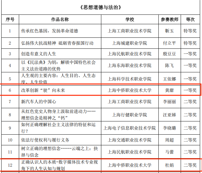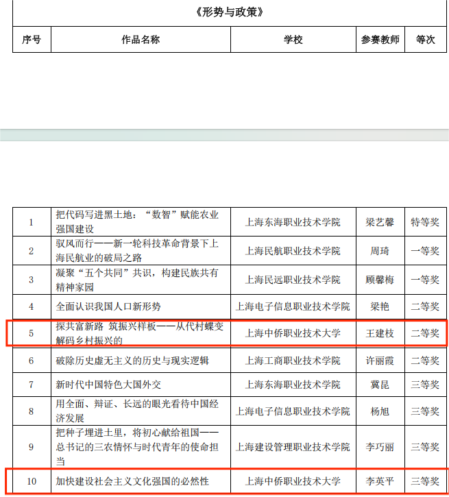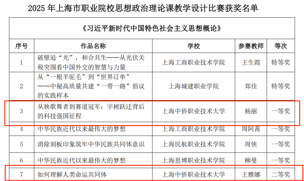 近日,在2025年上海市本科及高职高专院校思想政治理论课教学案例比赛和2025年上海市职业院校思想政治理论课教学设计比赛中,我校马克思主义学院取得优异成绩,共荣获特等奖1项、一等奖5项、二等奖7项和三等奖4项,充分体现出学院深耕思政教学、推进实践创新的过硬本领与突出成效。