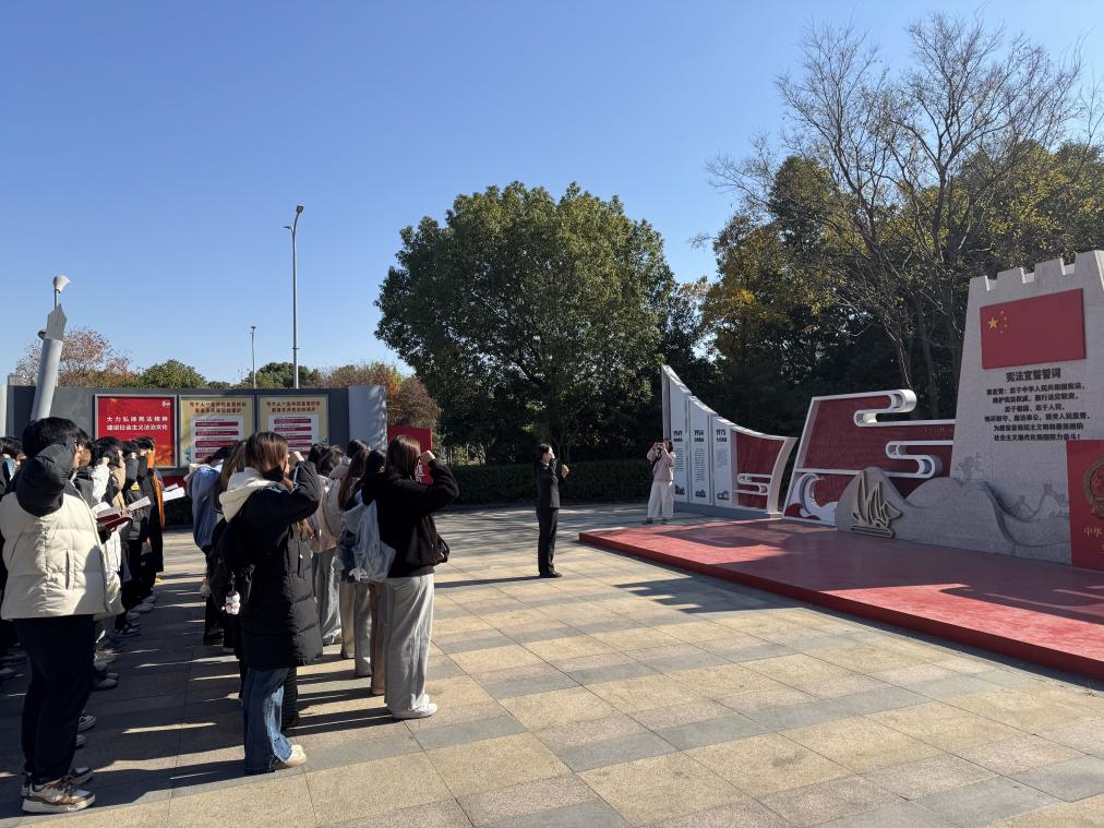 国家宪法日当天的宪法主题公园实践,是法治精神从文本走向现实的鲜活延伸。活动伊始,庄严肃穆的法治文化广场上,全体师生身着整齐服装,面向鲜红的国旗肃立。“我宣誓:忠于中华人民共和国宪法,维护宪法权威,履行法定职责……”激昂的誓言声中,师生们高举右拳,神情庄重,每一个字都铿锵有力,回荡在广场上空。这场宣誓不仅是对宪法的庄严承诺,更承载着一份特殊的责任担当——未来,他们将凭借专业知识与实践能力,积极参与立法意见征询,让基层群众的心声通过“立法直通车”直达法治建设前沿,为完善法律法规注入高校智慧。