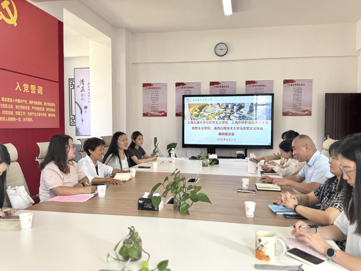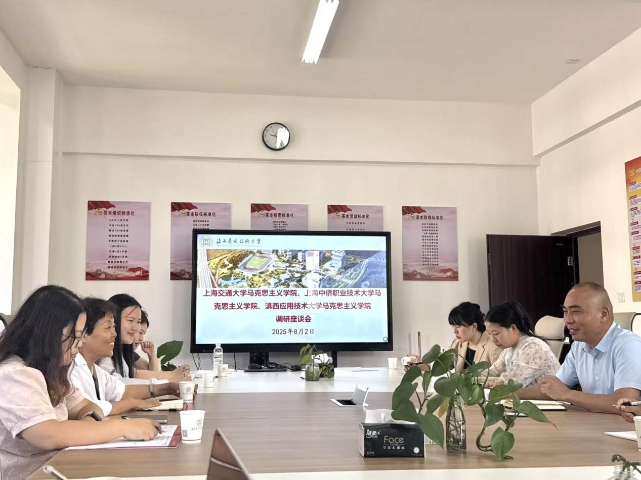 为深入贯彻落实习近平总书记关于思政课建设的重要指示精神,深化沪滇教育协作,2025年8月2日,上海交通大学、上海中侨职业技术大学与滇西应用技术大学马克思主义学院共同举办调研座谈会。活动以习近平新时代中国特色社会主义思想融入思政课教学为核心,探索职教特色思政育人路径,同时结合本科评估工作要求,推动校际资源共享与经验互鉴。上海交通大学马克思主义学院教师代表、上海中侨职业技术大学马克思主义学院党支部书记封晓莉、教学副院长郭晓平以及学院教师代表,滇西应用技术大学马克思主义学院院长王国强以及学院教师代表出席。