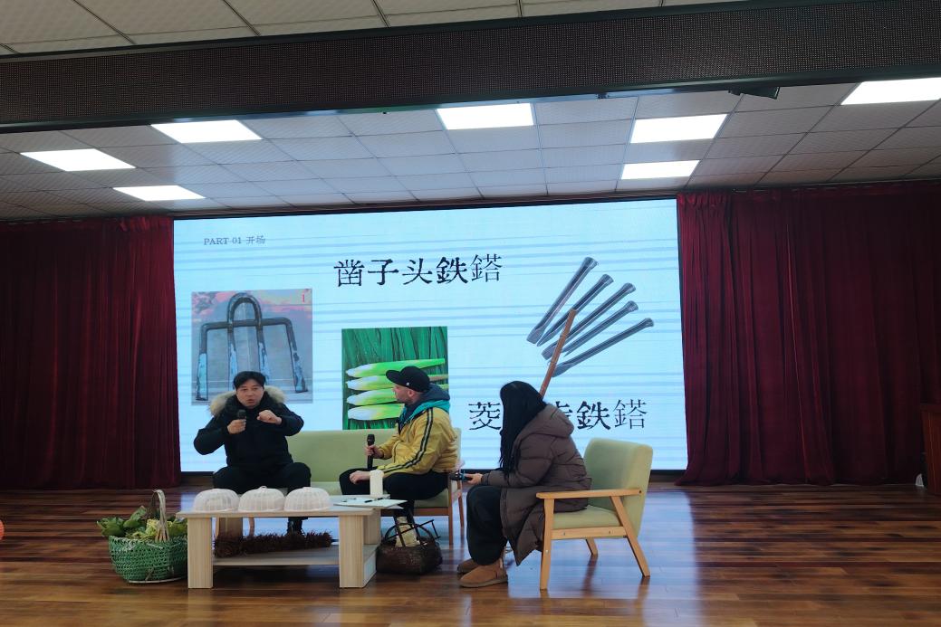 在秦阳村乡音馆内,铁鎝、桠叉等承载着农耕文明记忆的传统器具,成为思政教育的鲜活教材。阿庆老师结合乡村生活实践,生动解读“铁鎝(锄头)”“歪(镰刀)”等器具的方言称谓及背后的生产生活智慧;吴飞得老师则从语言学角度,溯源词汇中的古吴语渊源,解析金山方言声调丰富、同音现象显著的独特语言魅力,让学生在器具认知与语言探究中,触摸地域文化的根脉。