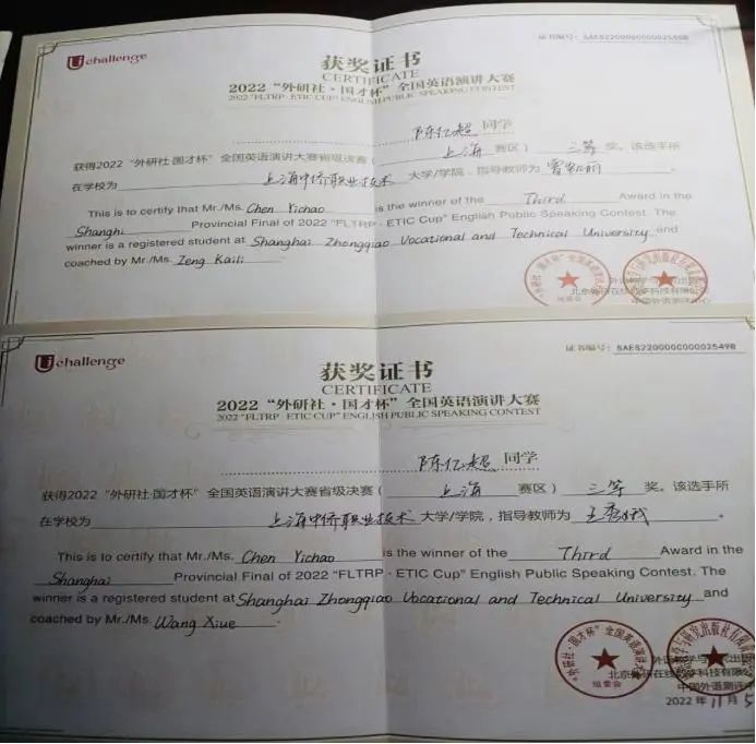 The 2022 "FLTRP · Guocai Cup" National English Speech Contest (Undergraduate Group) concluded successfully in Shanghai Second University of Technology on November 6. The competition was co-sponsored by the Foreign Language Teaching and Research Press and the China Foreign Language and Education Research Center. The outstanding contestants from 30 undergraduate colleges and universities in the city gave a full, vivid and wonderful speech on the stage. Chen Yichao, a Grade 20 engineering cost major in our school, won the third prize with confidence and strength. The instructors were Zeng Kaili and Wang Xiu'e.