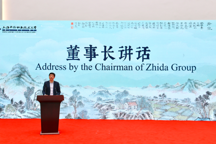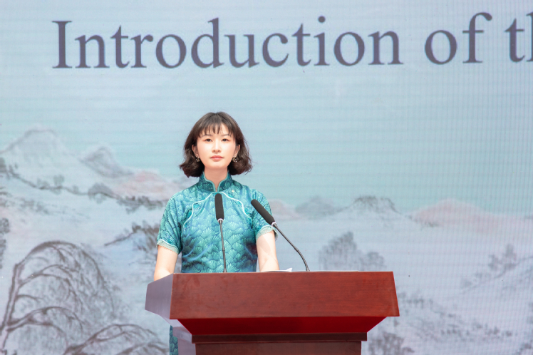 Shortly after Prof. Huo’s remarks, Miss Yan, Dean of SIE, briefed the audience on SIE’s objectives, education philosophy, and also the preparatory work that has been done so far. In illustrating SIE’s education philosophy, Miss Yan made the full use of the ceremony’s background board painting, making clear that SIE’s education should always not only be based on Western knowledge and advanced concepts but also be firmly rooted in tradition and regional culture, which guarantees that Chinese culture will work as indispensable fabrics in SIE’s education. The original paint, crafted by Mr. Zheng Beinan, a master in landscape painting of its Shanghai School, was accomplished with “Shen-Yuan” techniques by depicting local Jinshan countryside scenery and yet by presenting itself from the perspective of Western landscape painting in 19th century, making a perfect example to serve Miss Yan’s purpose.