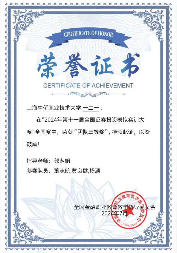 In July 2024, the 11th National Securities Investment Simulation Training Competition successfully concluded. Under the professional guidance of Huang Kanmei and Guo Shujuan, directors of the Application of FinTech major and Securities Practice major in the School of Economics and Management, the participating teams from the Application of FinTech (undergraduate) major and Securities Practice major of our school performed exceptionally well. They won a total of 2 first prizes, 2 second prizes, and 5 third prizes. Specifically, in the undergraduate group, they secured 1 second prize and 4 third prizes. In the Vocational Education Group, they won 2 first prizes, 1 second prize, and 1 third prize.