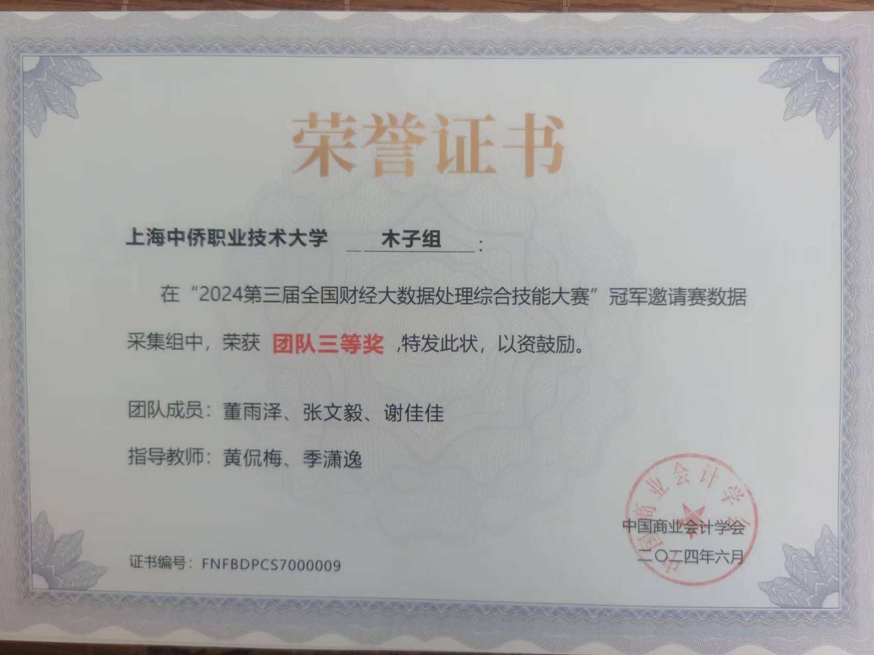 The 2024 National Financial Big Data Processing Comprehensive Skills Competition was sponsored by the China Business Accounting Institute(CBAI), hosted by Wuhan Technology and Business University and Jiangsu Vocational Institute of Commerce, and supported by CSMAR. A total of 308 universities from 23 provinces, municipalities, and autonomous regions participated in the competition, with 1,320 undergraduate teams taking part. The competition was divided into two tracks: the Data Acquisition Group and the Data Analysis Group. Each track was further divided into a knowledge competition module and a data operation module. The operation module of the Data Acquisition Group was divided into "Data Acquisition," "Data Cleaning," and "Data Storage and Query," while the Data Analysis Group's operation module included "Data Acquisition," "Data Preprocessing," and "Python Data Analysis." Four teams from the 2022 and 2023 cohorts of the Financial Technology Application Major in the School of Economics and Management participated in the competition, with two teams, "Zhongqiao Buffett" and "Muzi Group," winning third prize.