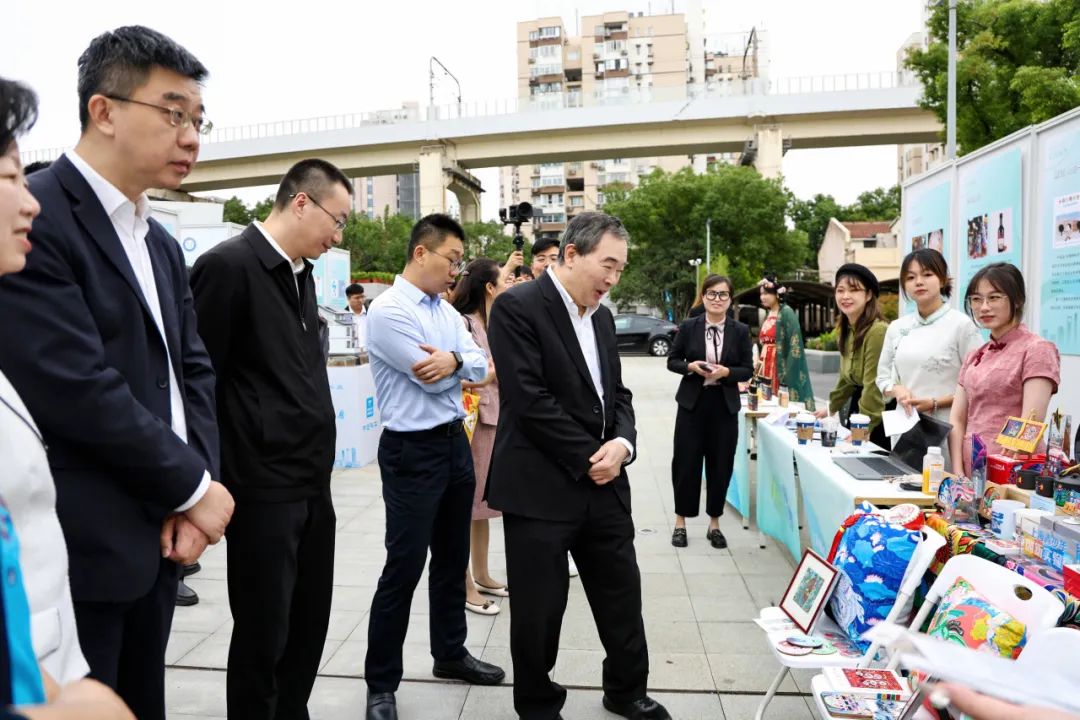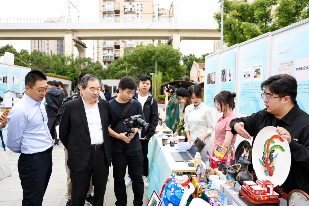 Pu Muming, an academician of the CAS Member, a foreign academician of the American Academy of Sciences, an academic director of the Center for Excellence and Innovation in Brain Science and Intelligent Technology of the Chinese Academy of Sciences, and Wang Jiang, deputy secretary of the Shanghai Municipal Committee of the Communist Youth League, secretary and president of the Communist Youth League of Shanghai, and president of the Shanghai Innovation Institute, visited the booth of the Art School of Shanghai Zhongqiao Polytechnic University in person. Liu Pengxiang and Fang Tianyi, two students, introduced in detail to experts and leaders the artistic characteristics of Jinshan Farmers' Painting Art, Shanghai Intangible Cultural Heritage, Tinglin Black Pottery, and Anhui Intangible Cultural Heritage Phoenix Painting projects. These professional explanations won the appreciation of the guests.