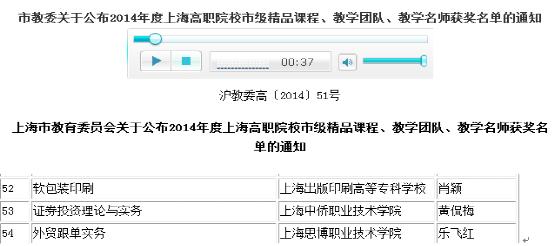 2014年9月证券与期货专业申报上海市市级精品课程——证券投资理论与实务课程,该课程是证券与期货专业的一门重要的专业基础课,也是考取证券从业资格,证券经纪人资格等职业资格证书课程。通过专业团队老师的努力,2014年底该课程终于成功入选上海市级精品课程