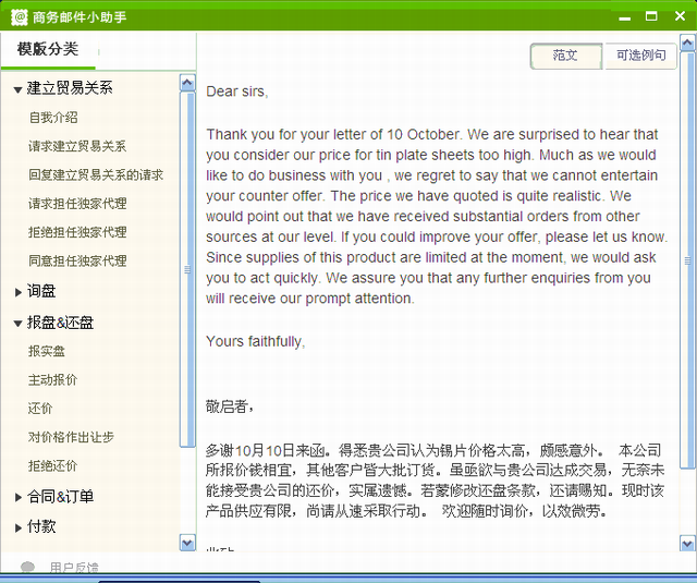 商务邮件小助手是一款功能强大且完全免费的外贸邮件助手软件,拥有非常实用的商务邮件范文和模板,能够帮助外贸人员更好的胜任外贸工作。软件界面简洁美观,拥有建立贸易关系、询盘、报盘还盘、合同订单、付款、包装唛头、装运、保险、抱怨索赔等分类模板,全部是中英文对照,能够帮助外贸工作人员更好地学习和应用。(点击下面图片下载)