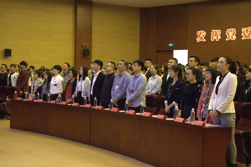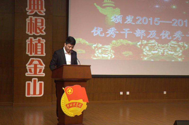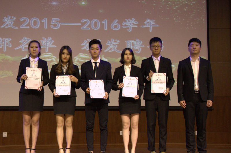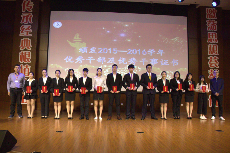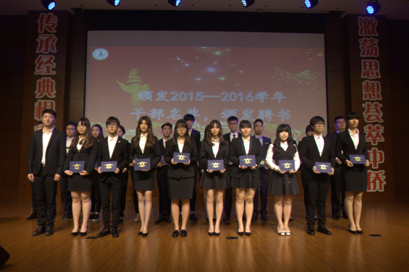 随即本次大会最令人期待的颁奖仪式正式开始了。由分团委书记郭骏老师宣读2015-2016学年优秀干部及干事名单并由石成玉和朱范鑫老师为14级优秀干部颁发荣誉证书,陈萍萍和唐斌老师为15级优秀干事颁发荣誉证书,接着宣读2016-2017学年干部名单,由郭骏老师为他们颁发聘书。