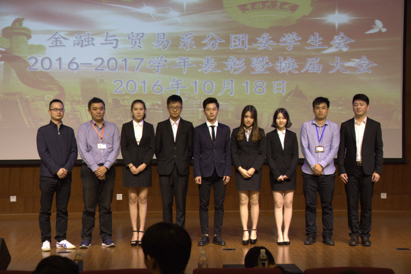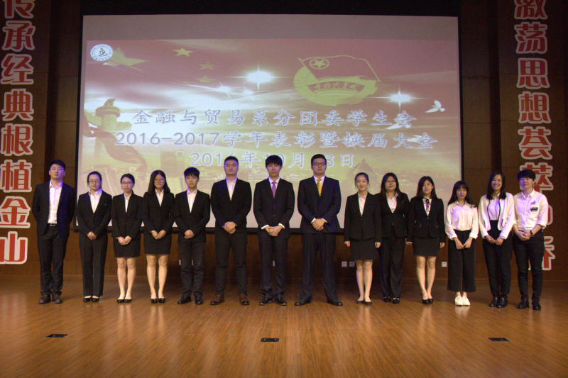 伴随着国际歌,本次大会圆满落幕,各部门与老师合影留念。此次换届大会不仅为我系注入了新的活力,而且充分调动了大家工作的积极性。不论前方的道路有多么冗长,相信金贸系的全体成员们都会微笑向前,全情投入,衣带渐宽终不悔,泰山崩于前而色不变!