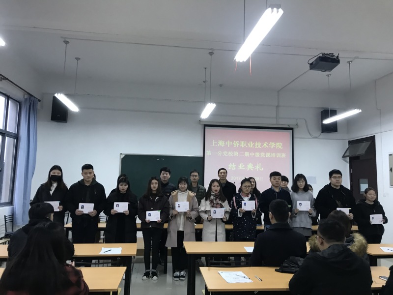 2017年12月28日下午3点45分,上海中侨职业技术学院第一分党校第二期中级党课培训班结业典礼在5号楼203教室举办。出席此次结业典礼的有经济与管理学院党总支书记石成玉老师、党总支副书记郭骏老师、党总支纪律委员孙斌老师、第一党支部书记兼党总支宣传委员陈萍萍老师、党总支组织委员李玲老师、第一党支部宣传委员曹小玉老师、全体大二辅导员以及全体中党结业积极分子。