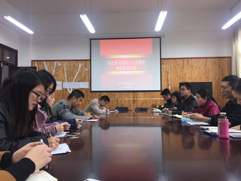 我院党总支书记石成玉强调,要贯彻落实统筹全局工作。以十九大精神为指导,特别以习近平新时代中国特色社会主义思想为指导,科学谋划新时代的新思路新举措,结合“两学一做”学习教育常态化制度化,推动全院党组织和师生党员自觉以新思想引领新实践。围绕立德树人的根本任务,把握正确的育人方向,以“四有”好老师为标准,不断增强立德树人的责任感和使命感,以实际工作成果来检验学习宣传贯彻党的十九大精神的成效。