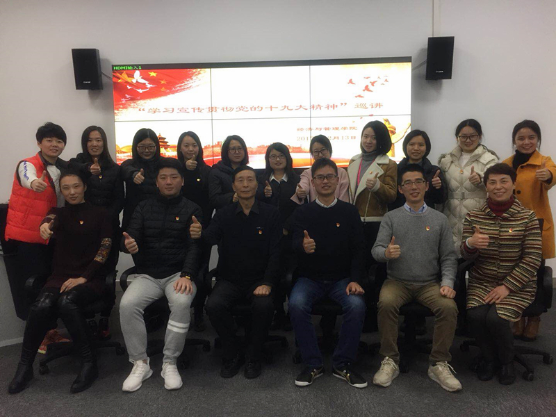 为贯彻落实中央关于推动十九大精神进校园、进网络等“七进”的要求,2017年12月13日上午九点,经济与管理学院举办了“学习宣传贯彻党的十九大精神——辅导员校园巡讲活动”,旨在动员广大辅导员和青年学生学在一起,讲在一起,悟在一起。经管学院党总支书记石成玉、副书记郭骏及全体辅导员、学生干部参加此次报告会。