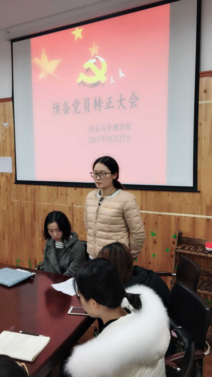 12月27日中午午12:00,经济与管理学院在3号楼313教室召开预备党员张坤同志转正审批大会。经管学院党总支书记石成玉以及第一党支部全体党员老师、预备党员、发展对象参与了此次会议。大会由第一党支部书记兼党总支宣传委员陈萍萍老师主持。