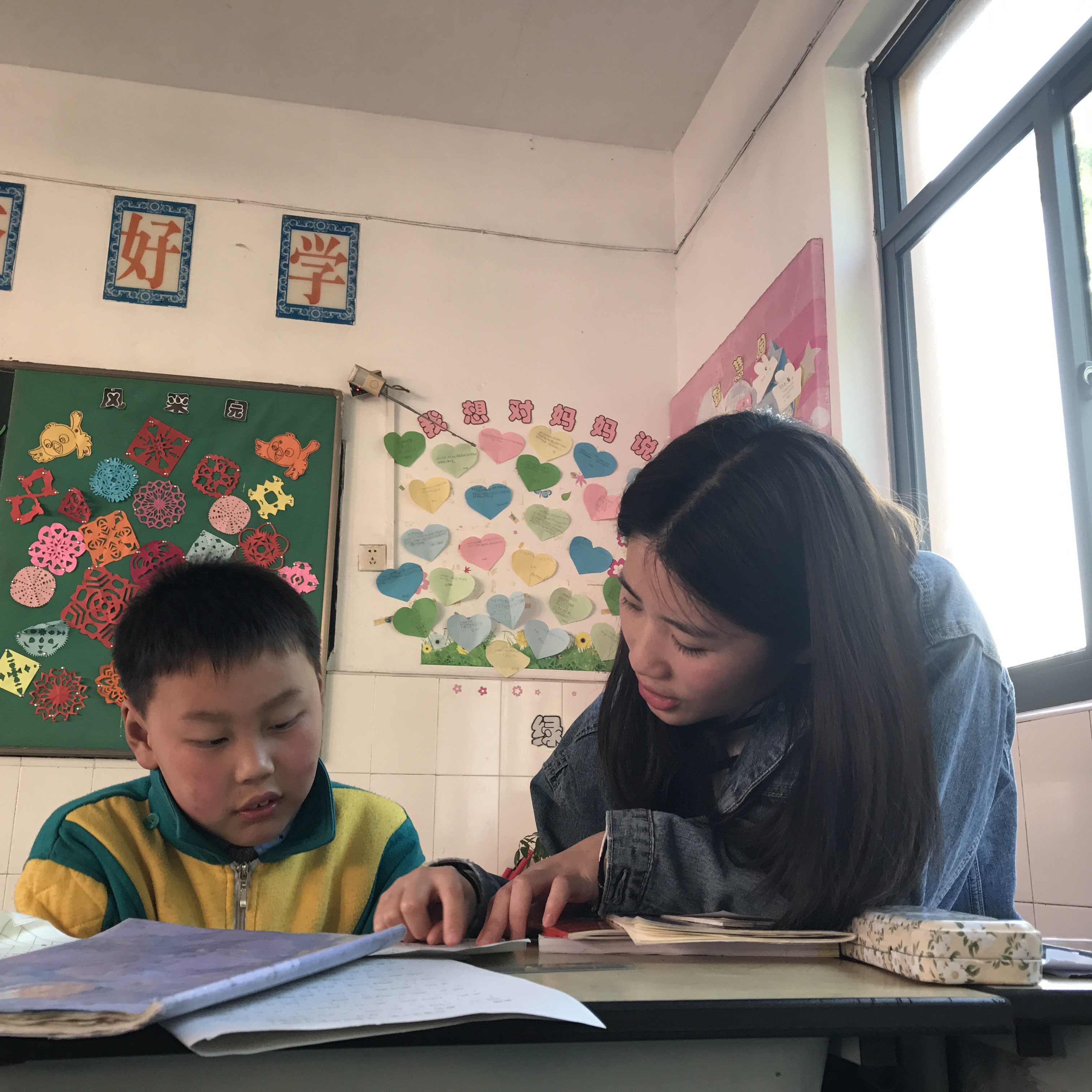 去给他第一次辅导功课的路上,因为这是我们第二次见面,我的心情是激动又紧张的。怕他等着,于是我提早到达了张堰小学等他放学。当下课铃一响,看到一个个活泼的身影在自己的身旁跑过,我真的倍感亲切,想起曾经这个年纪的自己。传过人群,走到他的班级门口,当我还在寻找他在哪时,他就已经先看到我,蹦跶着到我面前说:“陈老师,你来啦~”。他看上去很开心的样子。