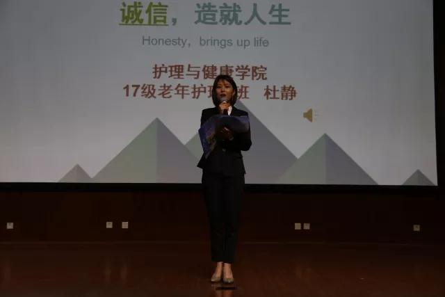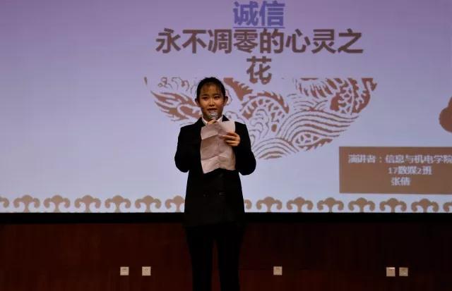宋银萍演讲的题目是《诚信,一盏心灯》,她用甜美的声音告诉大家作为当代大学生,在未来的生活当中我们要更加的严格要求自己,让诚信成为我们的准则,让生命因诚信而获得一次畅快地呼吸,为自己的人格填上一层亮色。