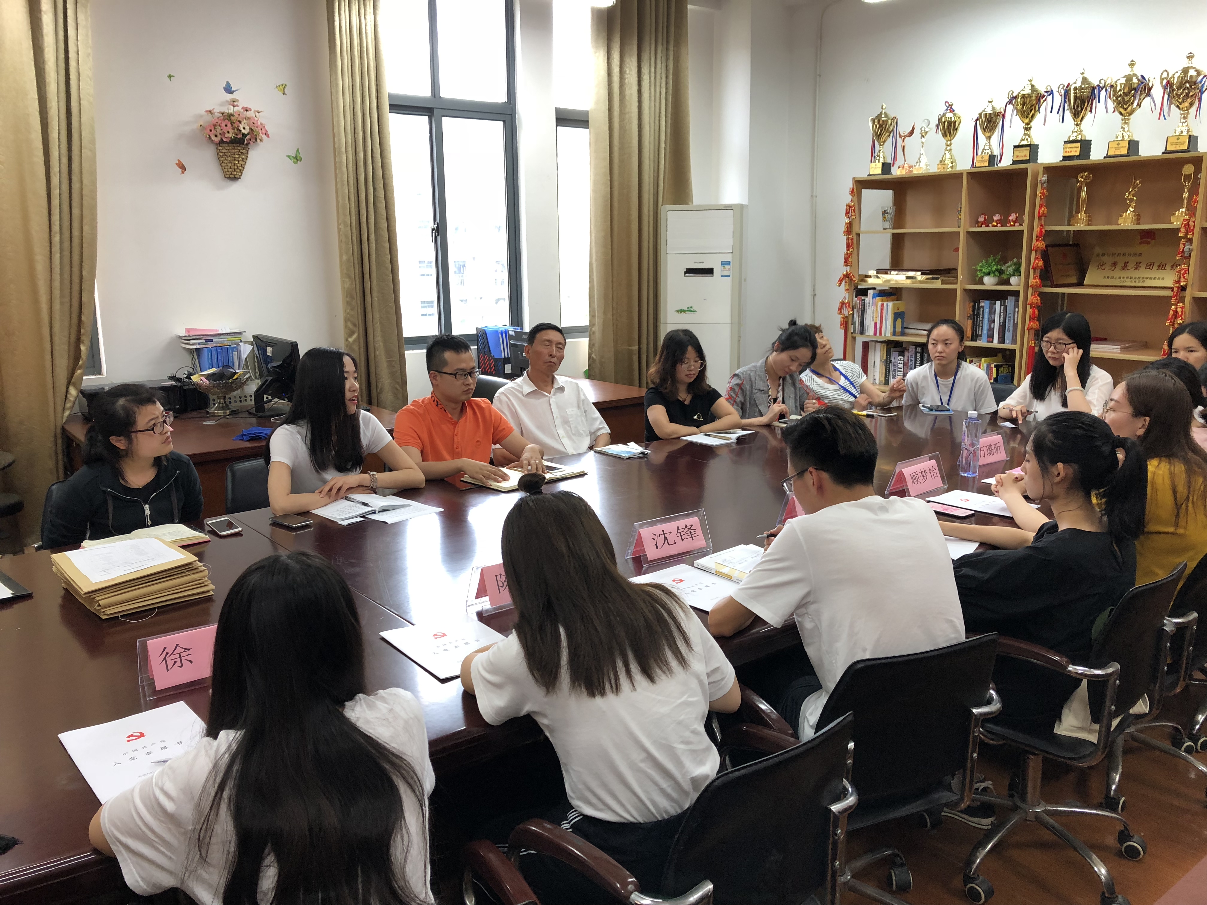 首先由审批对象16会计4班沈勤、16会计1班徐月、16旅游2班陈鑫、16物流2班沈锋、16金融2班徐静、16金融1班顾梦怡,16国商1班万璐昕和16会计6班尤倩进行自我介绍并从思想上、生活上、工作上和学习上分别进行阐述,之后由他们的第一入党介绍人孙斌老师、陈萍萍老师、曹小玉老师对他们进行客观评价以及向他们提出了建设性的意见和建议。最后所有在场的党员老师进行匿名投票,经表决,全票通过上述八名同学成为预备党员。