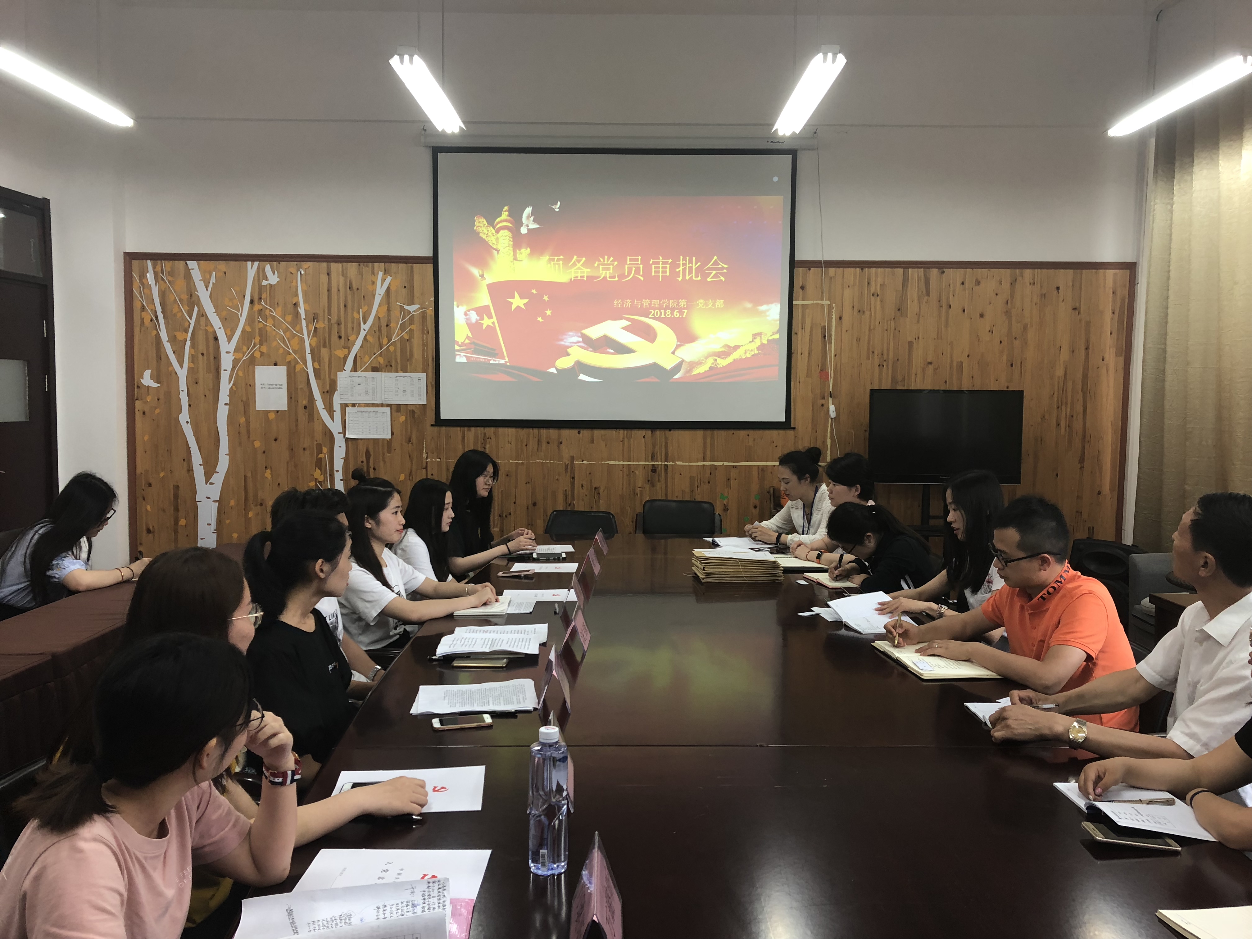 6月7日下午15:35分在3号楼313召开了经济与管理学院第一党支部预备党员审批大会。经管学院的全体党员教师以及8名审批对象参加了大会。该大会由陈萍萍老师主持。