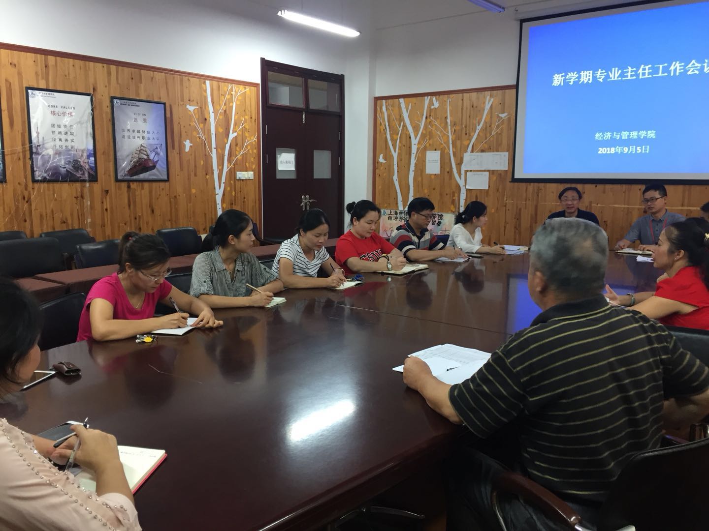 2018年9月5日周三中午12:30,在3号楼313会议室,经济与管理学院召开新学期专业主任工作会议,研讨经管学院专业发展问题,本次会议由常务副院长张炳达教授主持,党总支书记石成玉老师,副院长郑玲老师,杨莲珠老师,院长助理杨慧老师和李娟老师以及各专业主任参会。