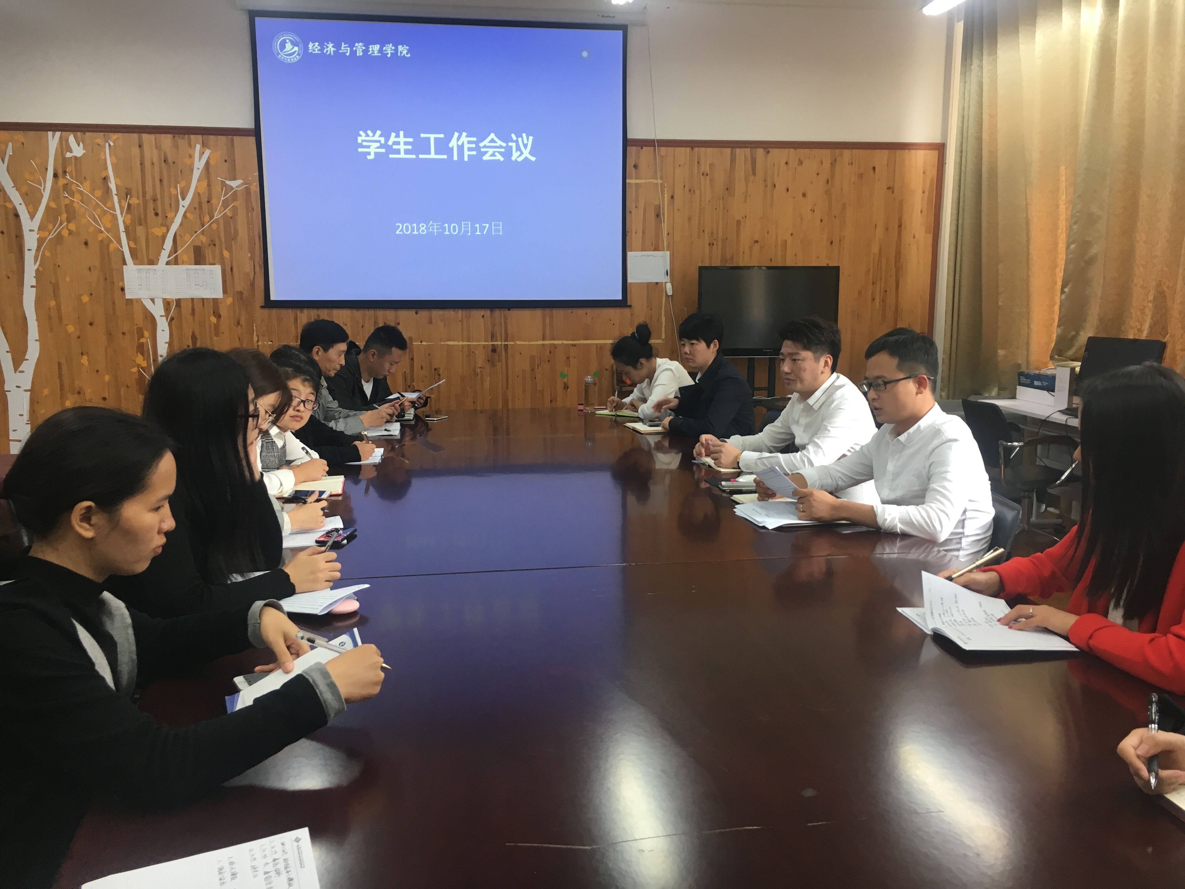 10月17日下午13:00,经济与管理学院在3号楼313召开学生工作会议。会议由经济与管理学院党总支书记石成玉老师主持、党总支副书记郭骏老师和全体辅导员参加。会议主要围绕传达学工工作会议精神及解读《2018-2019学年校风学风建设实施方案及细则》为主题展开。