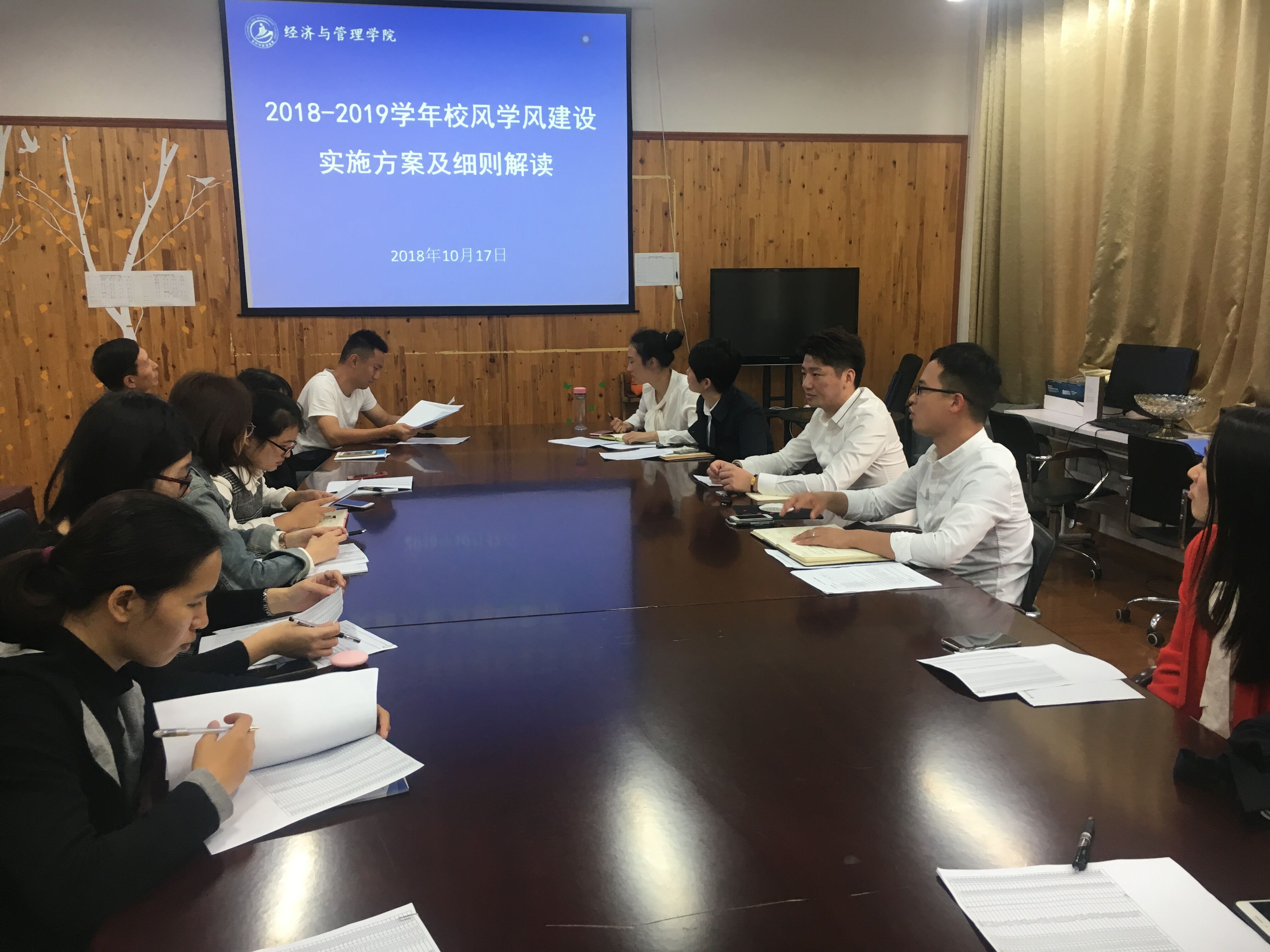 会上,石成玉老师首先肯定了各位辅导员老师近期的工作,学生工作也在有条不紊地开展。随后,石老师详细讲解了《2018-2019学年校风学风建设实施方案及细则》。他不仅将文件需要重点把握的内容进行了讲解,还跟大家分享了一些建设良好校风学风的方法及经验。