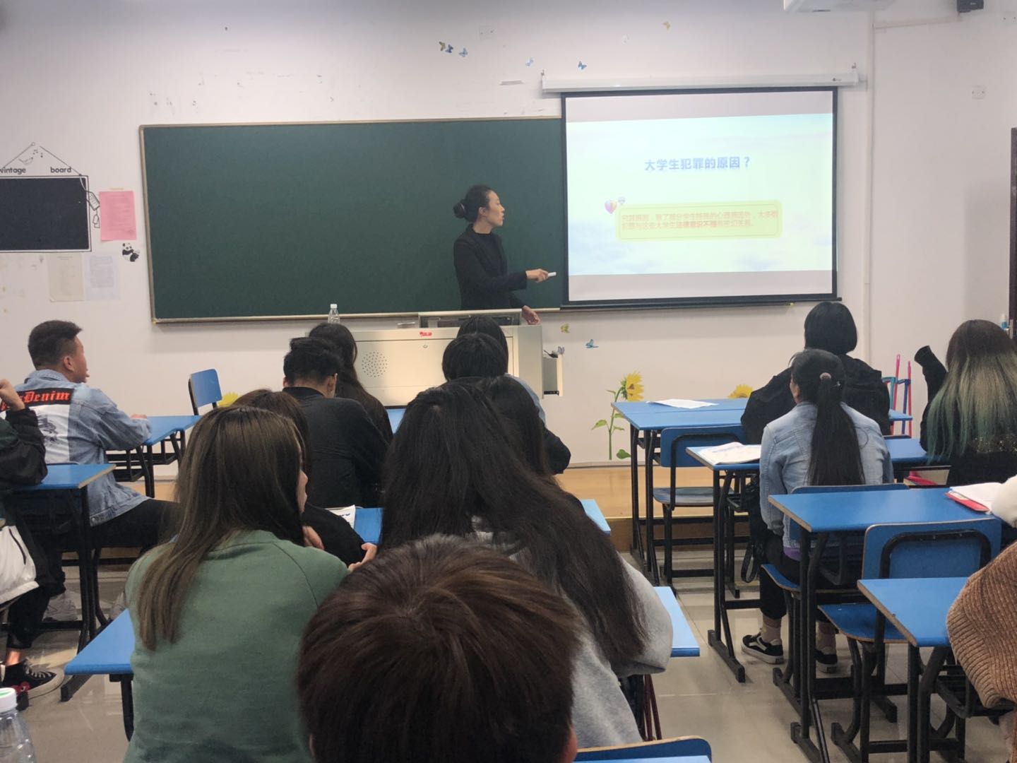 在班会中,高萌老师首先为大家介绍了大学生发生违法行为的主要原因——法律意识淡薄,指明很多违法行为的发生是因为学生没有意识到这种行为的违法性。然后向大家介绍了和在校大学生关系比较密切的法律法规,向学生明确了常见法律的责任年龄,提醒学生已年满18周岁的大学生已达到了刑法、民法和行政法的责任年龄,一旦触犯法律,均需负法律责任。然后老师通过案例的方式向大家介绍了在校大学生常见的犯罪行为,让大家对各种违法行为有了透彻的认识。