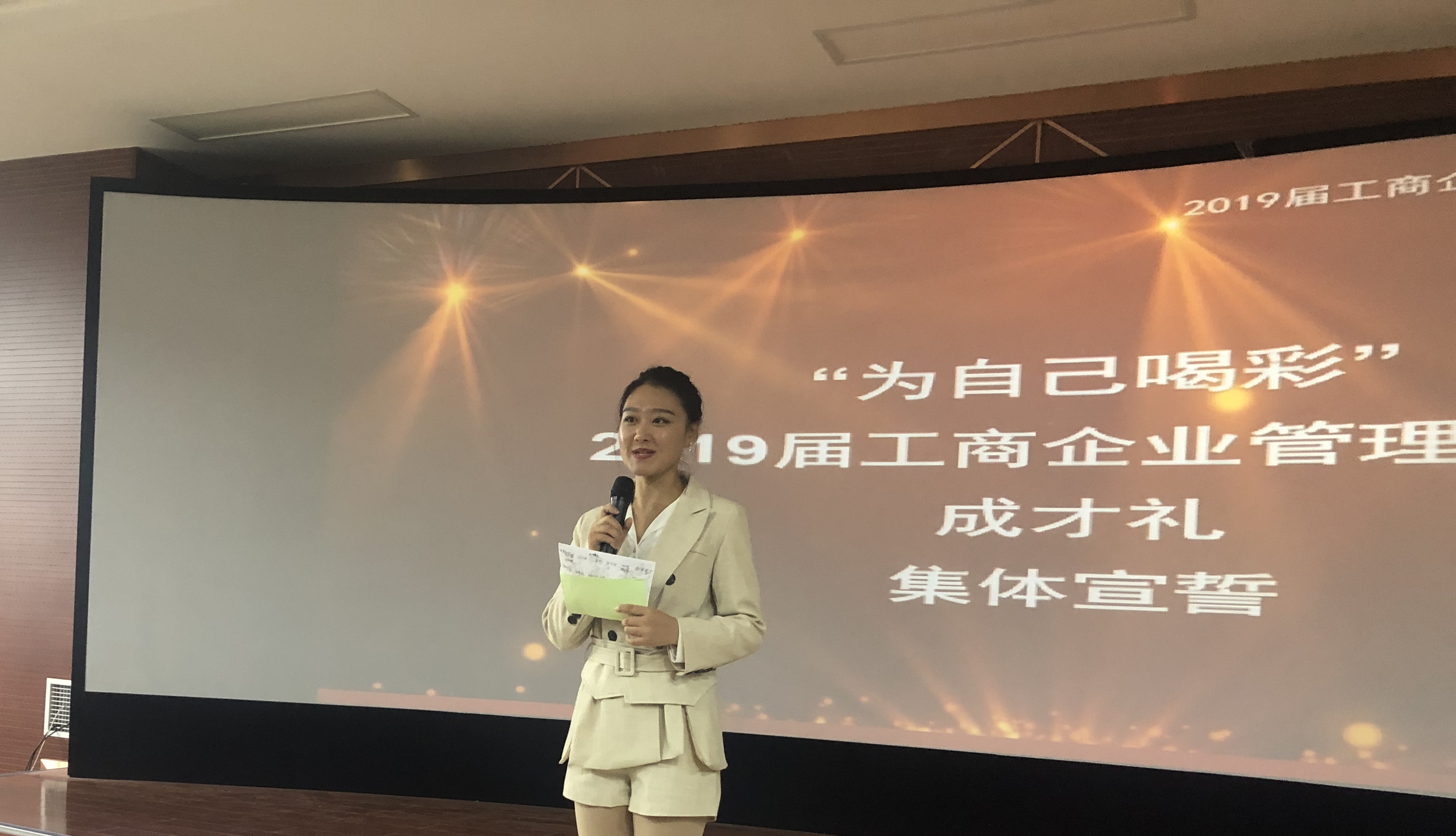 活动在激昂的音乐声中拉开帷幕,全体同学以礼仪坐姿迎接自己“成才礼”的到来。16工商1班的朱琳同学作为主持人,向各位领导、教师、同学致欢迎词。