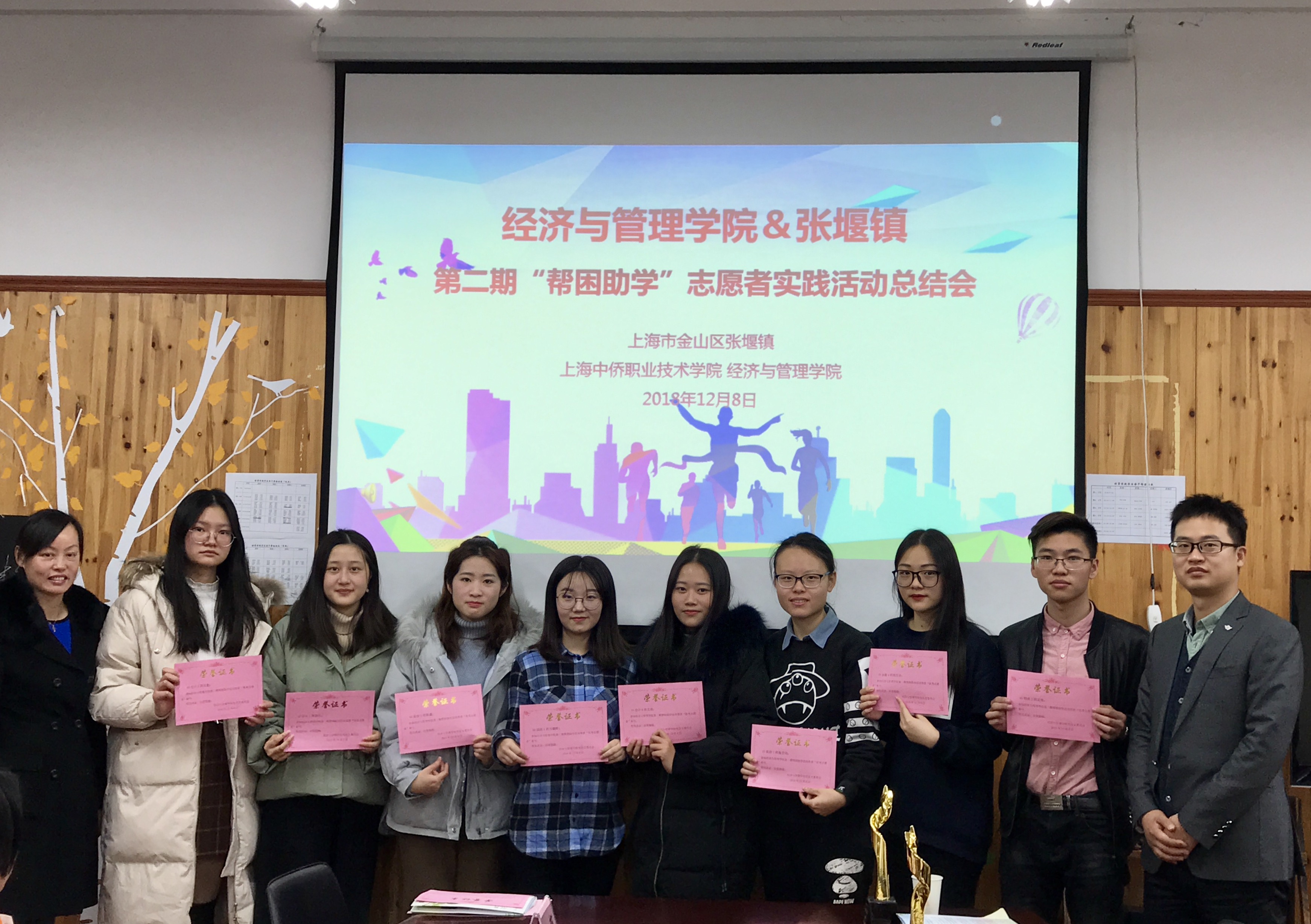 2018年12月8日上午10点,上海中侨职业技术学院经济与管理学院&金山区张堰镇第二期“帮困助学”志愿者实践活动总结暨表彰大会在经济与管理学院3号楼313会议室举行。经济与管理学院党总支部书记石成玉、副书记郭骏、组织委员李玲、分团委书记岳建梅、张堰镇社事办主任兼红十字常务副会长陶伟红、全体志愿者以及受助学生和家长等近30人参加了大会。大会由经济与管理学院党总支部副书记郭骏主持。