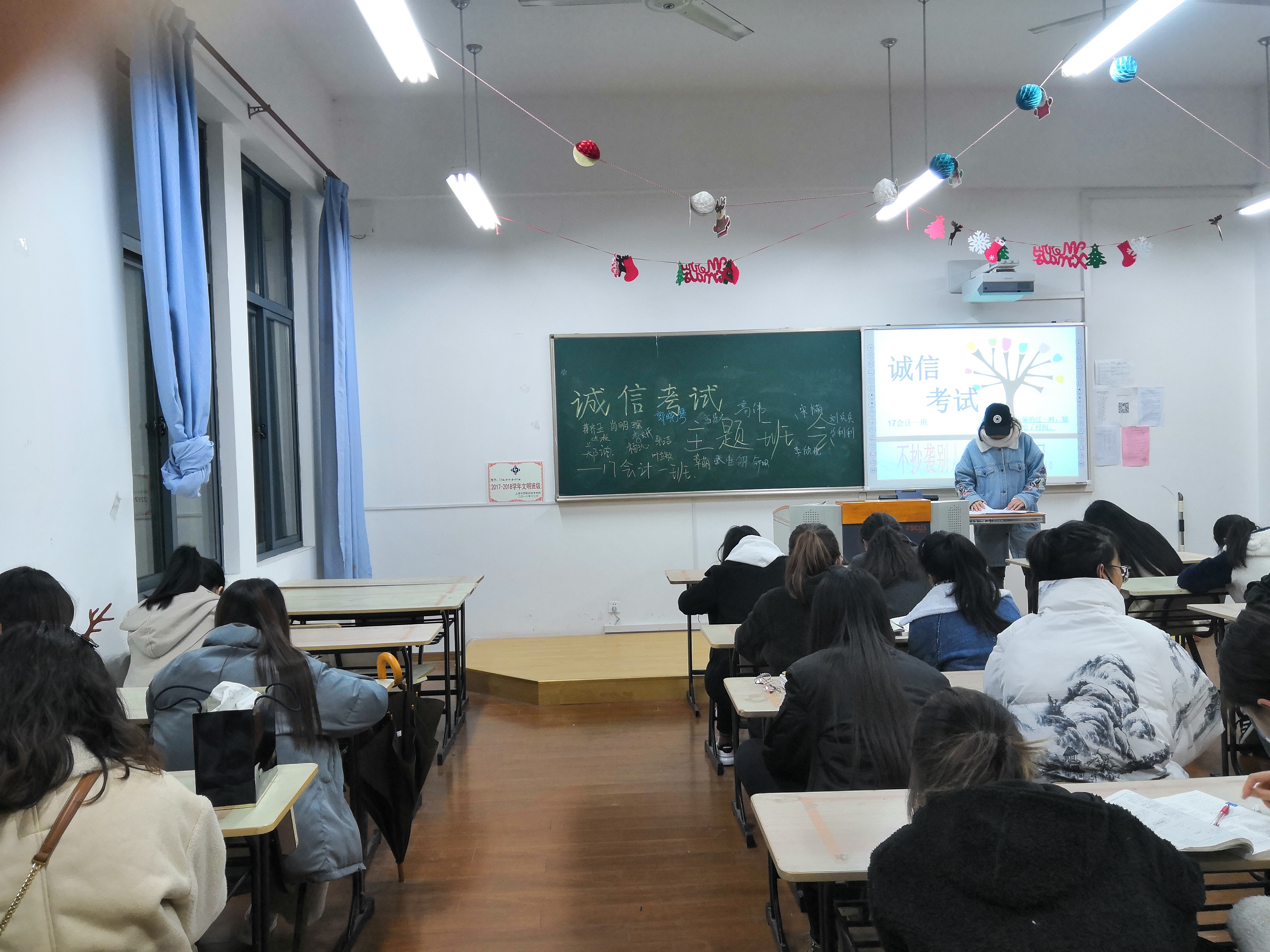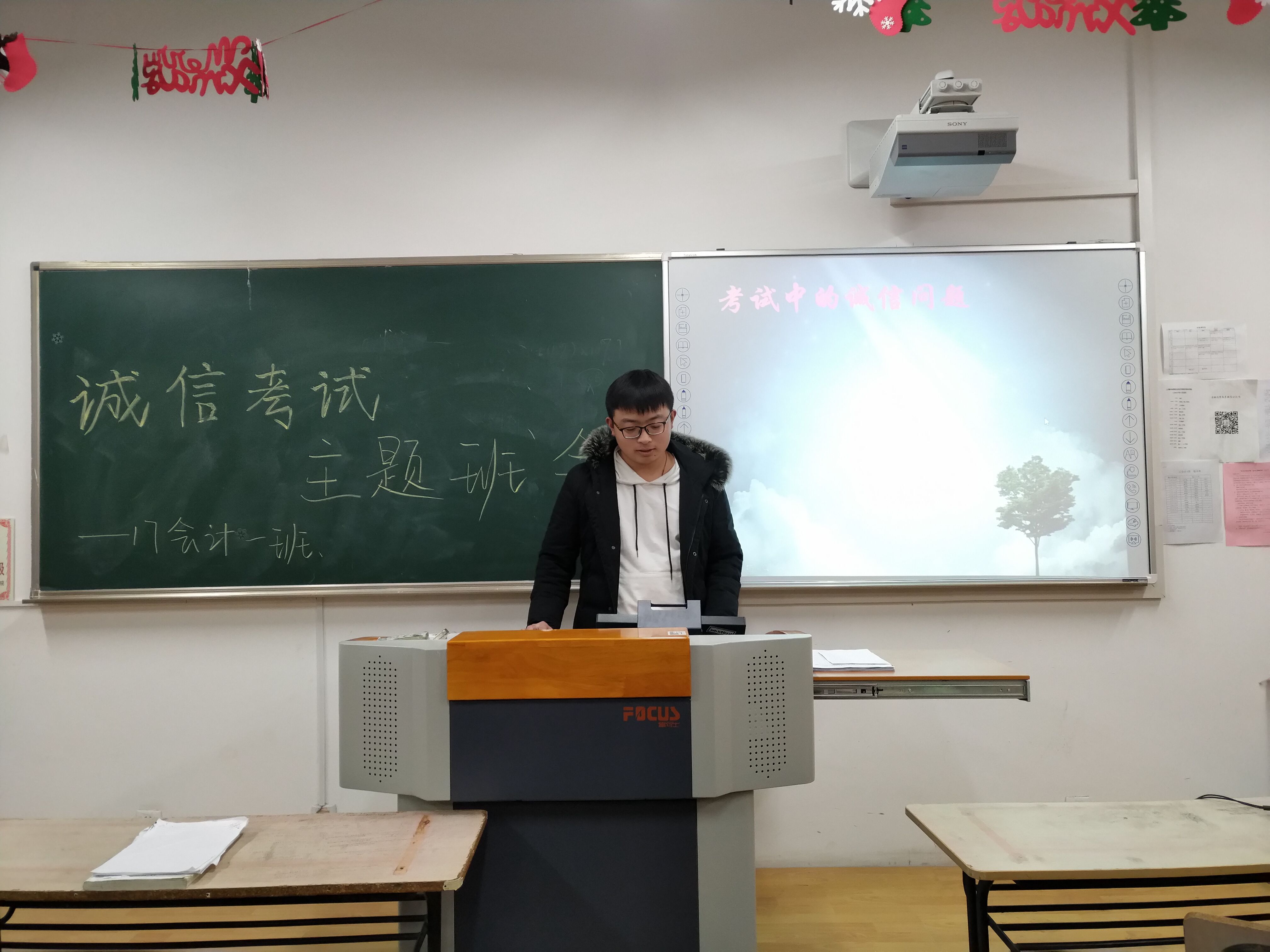 为切实增强学生贯彻落实诚信考试的思想,保障教学质量,加强学生文明意识,2018年12月25日经管学院17会计1班全体同学在班级开展了“诚信考试”主题班会,此次班会由班长主持,和同学们一起谈论诚信考试问题。