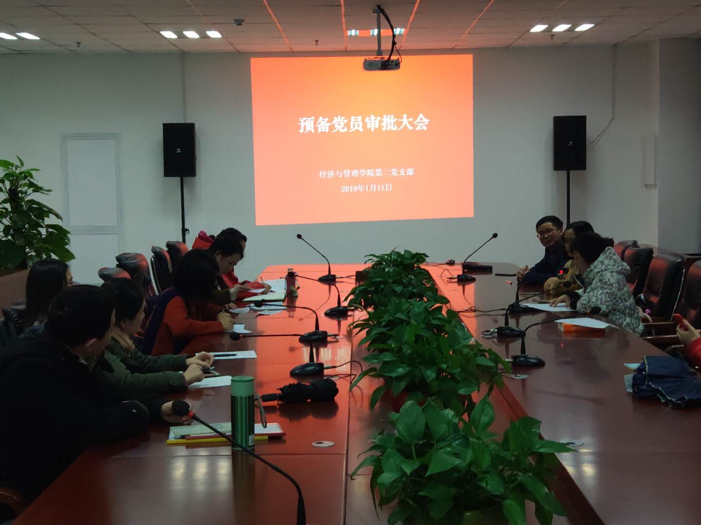 1月11日下午,经济与管理学院第二党支部在图文信息楼208会议室召开党员大会,讨论接受张佩杰同志为中共预备党员。
