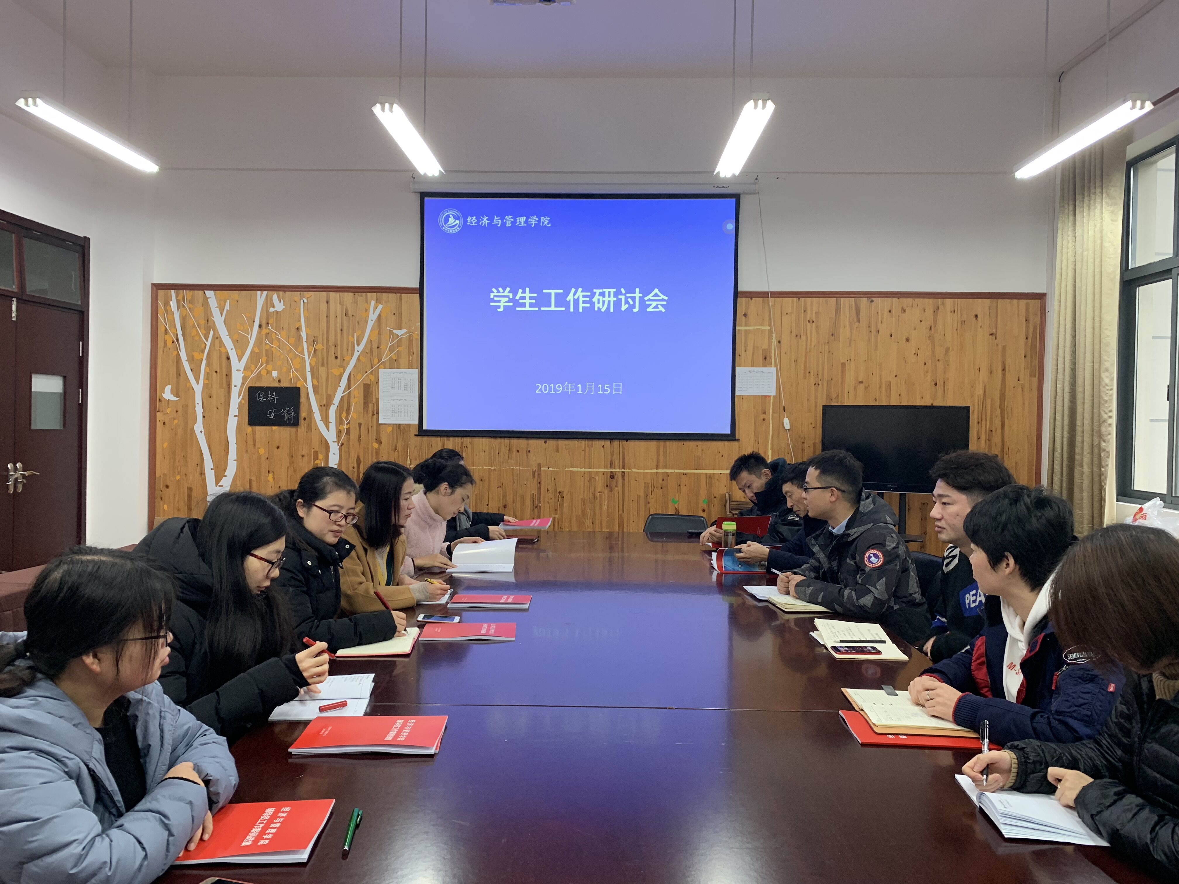 2019年1月15日上午,在经济与管理学院3号楼313会议室,学院党总支书记石成玉及副书记郭骏给全体辅导员召开了学期末学生工作会议,对本学期的学生工作进行研讨并下发了《经济与管理学院辅导员工作案例选集》。