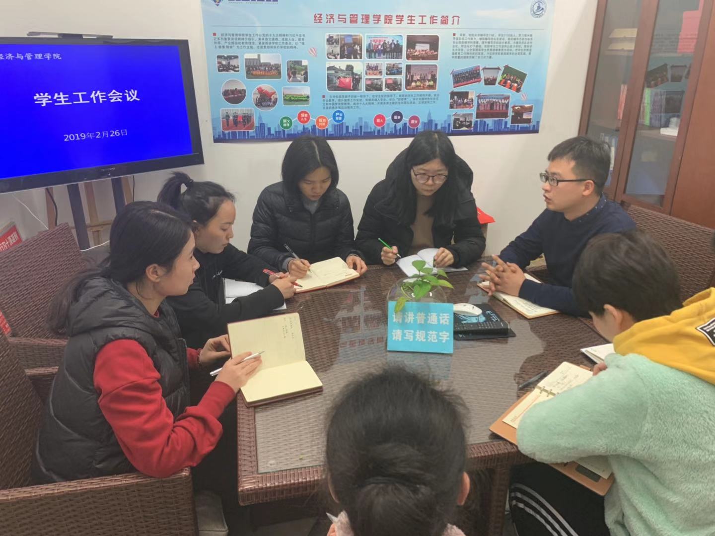2月26日下午,经济与管理学院2018-2019学年第二学期学生工作会议在3号楼205室召开。学院党总支部书记石成玉、副书记郭骏以及全体17、18级辅导员参加会议。会议由副书记郭骏主持。