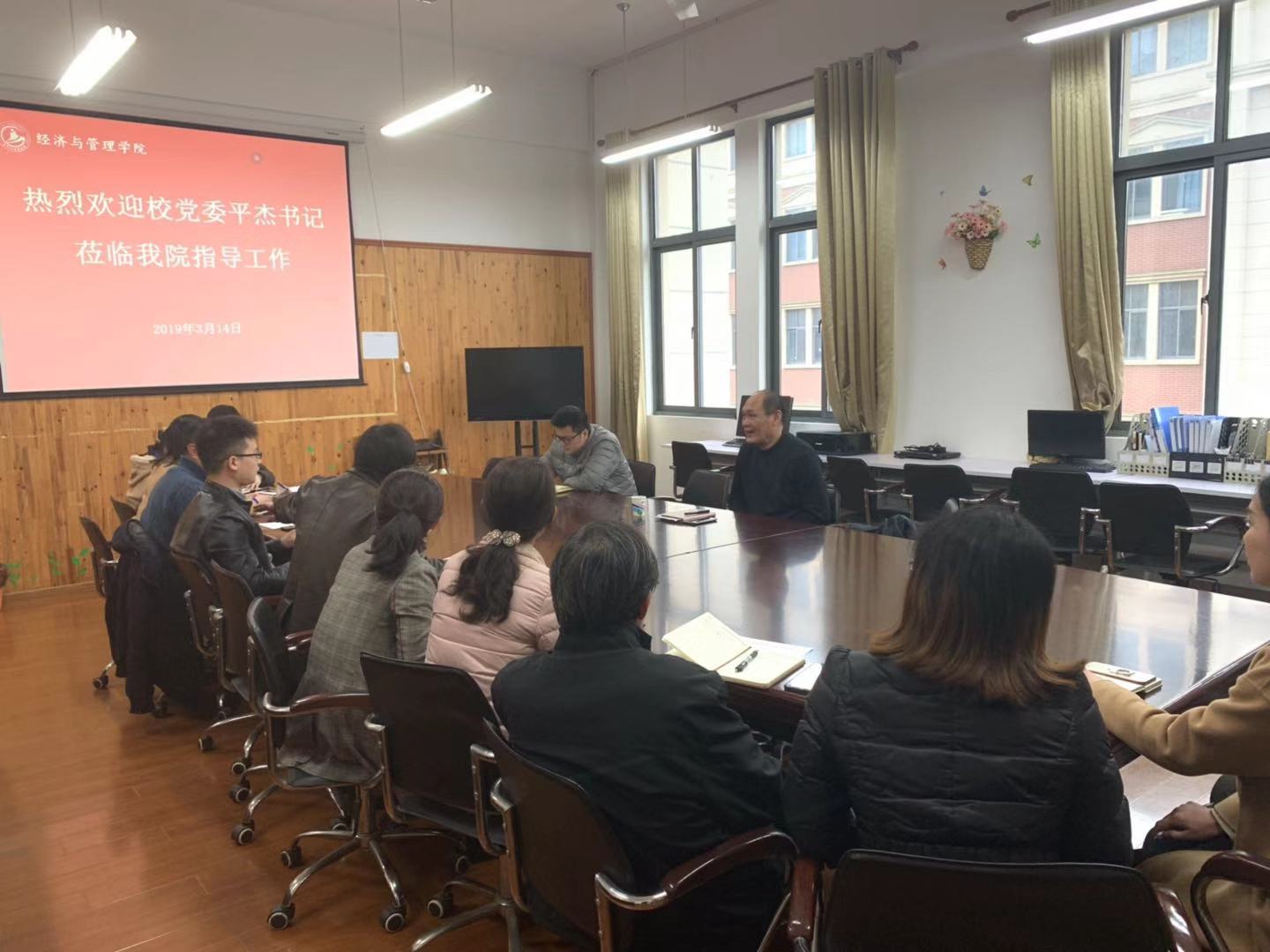 阳春三月,万象更新,百花齐放,314日下午,校党委书记平杰在党政办副主任单驹超的陪同下到经济与管理学院调研,经管学院常务副院长张炳达、教学副院长郑玲、党总支部书记石成玉、副书记郭骏、各专业主任参加调研。