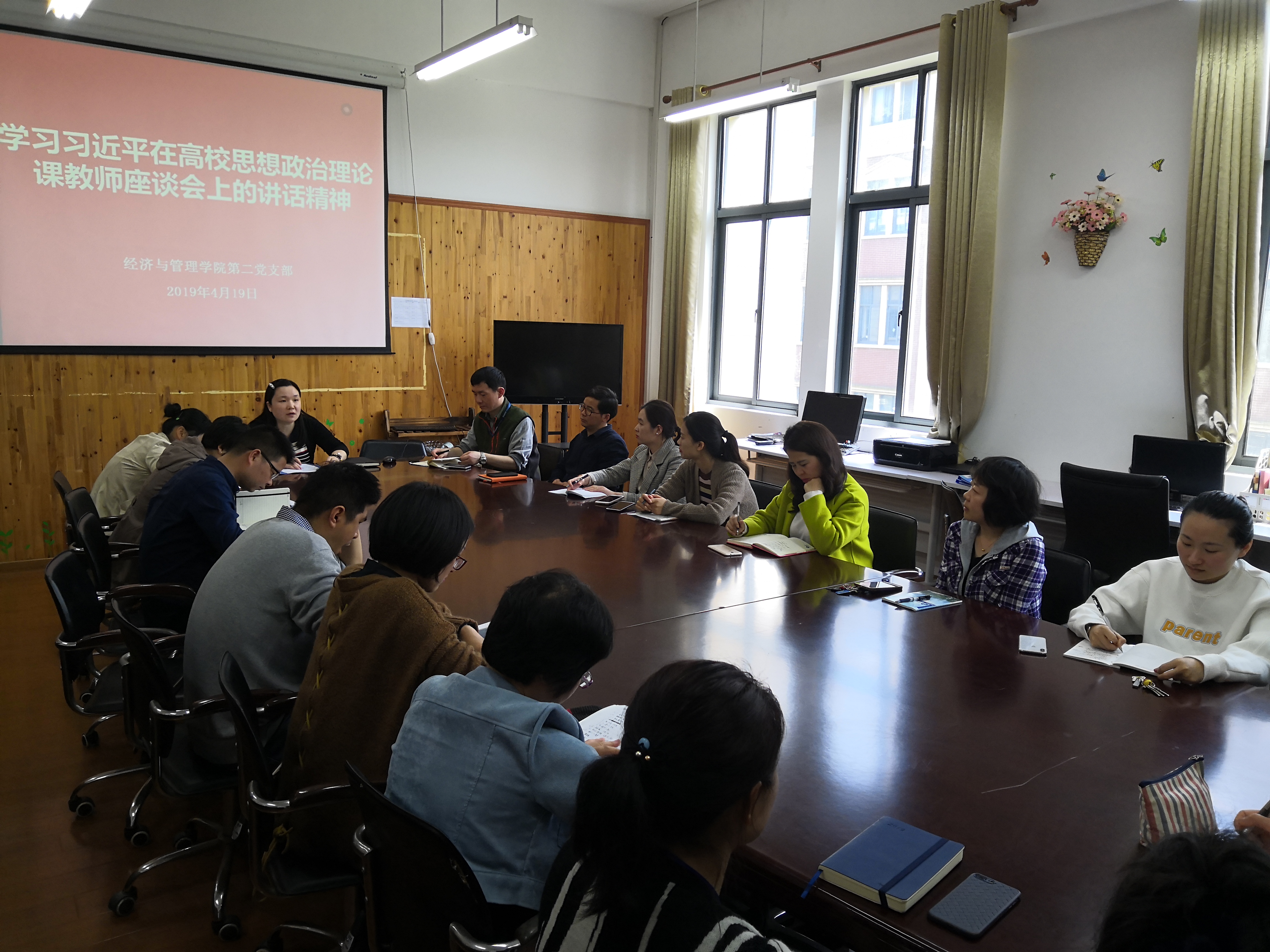 4月19日,经济与管理学院第二党支部全体党员学习“习近平总书记在学校思政课教师座谈会上的重要讲话”。学习活动由支部书记杨慧同志主持。