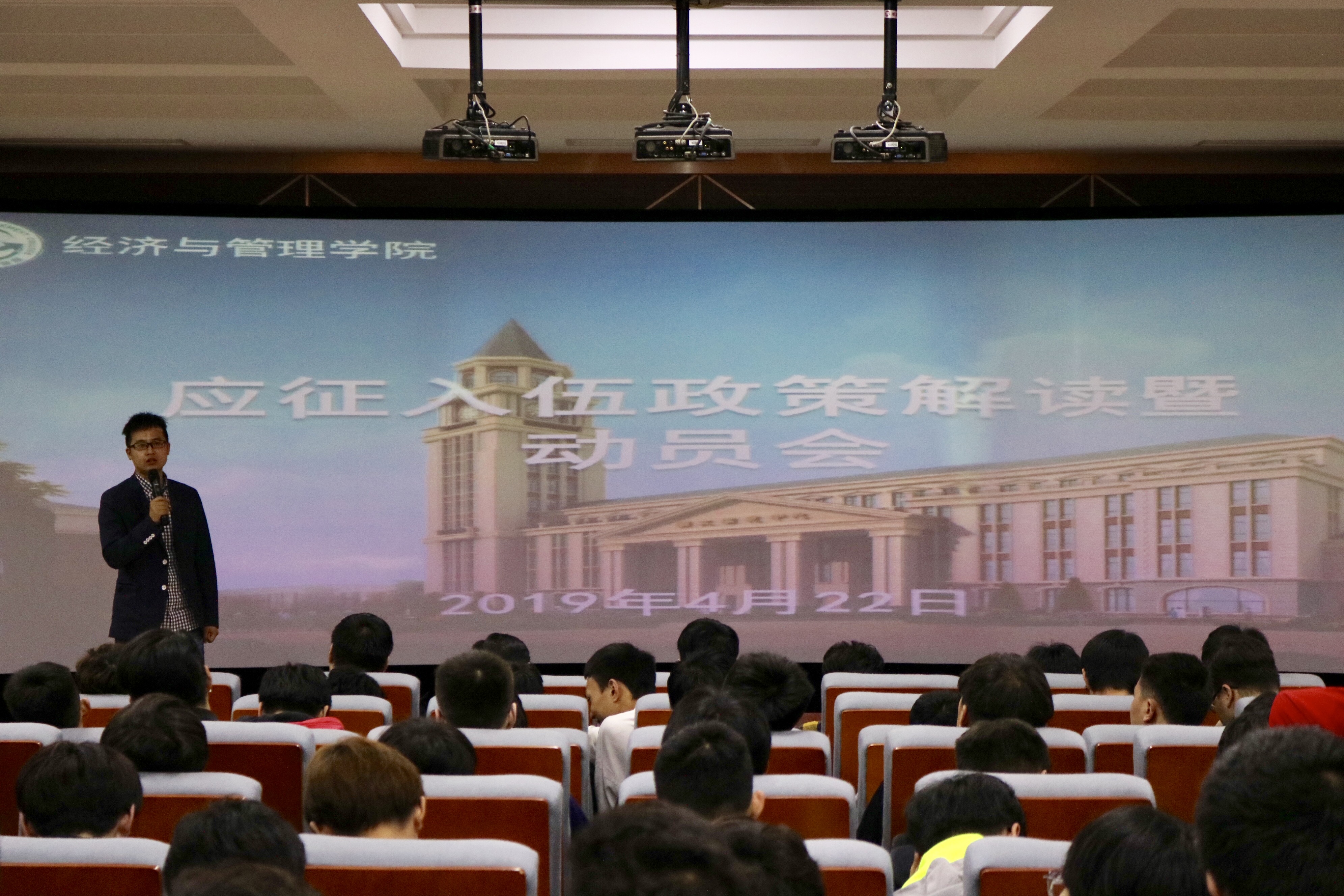 4月22日下午3:45,经管学院召开2019年征兵动员宣传动员会,特邀学校武装部陈佳政老师为同学们讲解。部分学生干部代表、全体辅导员参加会议,会议由经管学院党总支部书记石成玉主持。