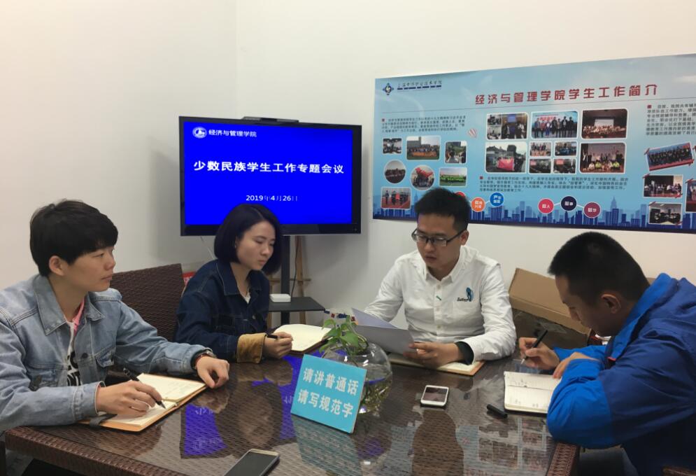 2019年4月26日上午9:00,经管学院召集全体少数民族学生辅导员,在3号楼313会议室召开少数民族学生工作会议,经管学院党总支部书记石成玉和副书记郭骏出席会议。