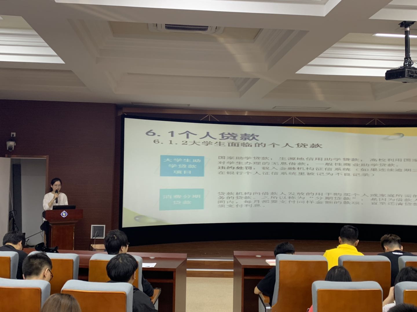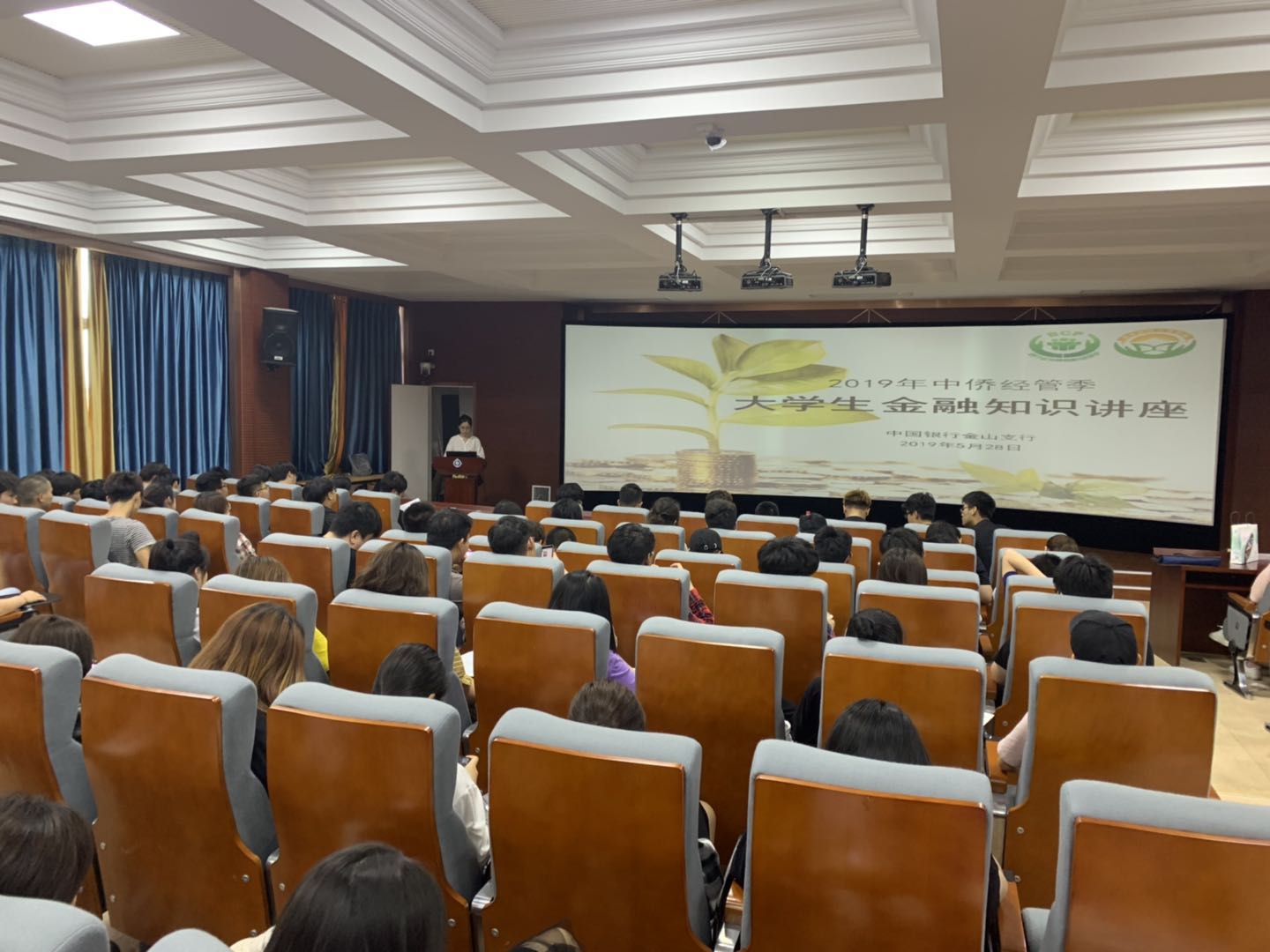 2019年5月28日下午15时45分,经济与管理学院在6号楼306报告厅开展“经管季”系列讲座之大学生金融知识,特邀中国银行金山支行的俞柳红老师为同学们讲解各种大学生应该具备的金融知识,提高大学生鉴别金融陷阱的能力,并培养了学生财务管理的意识。