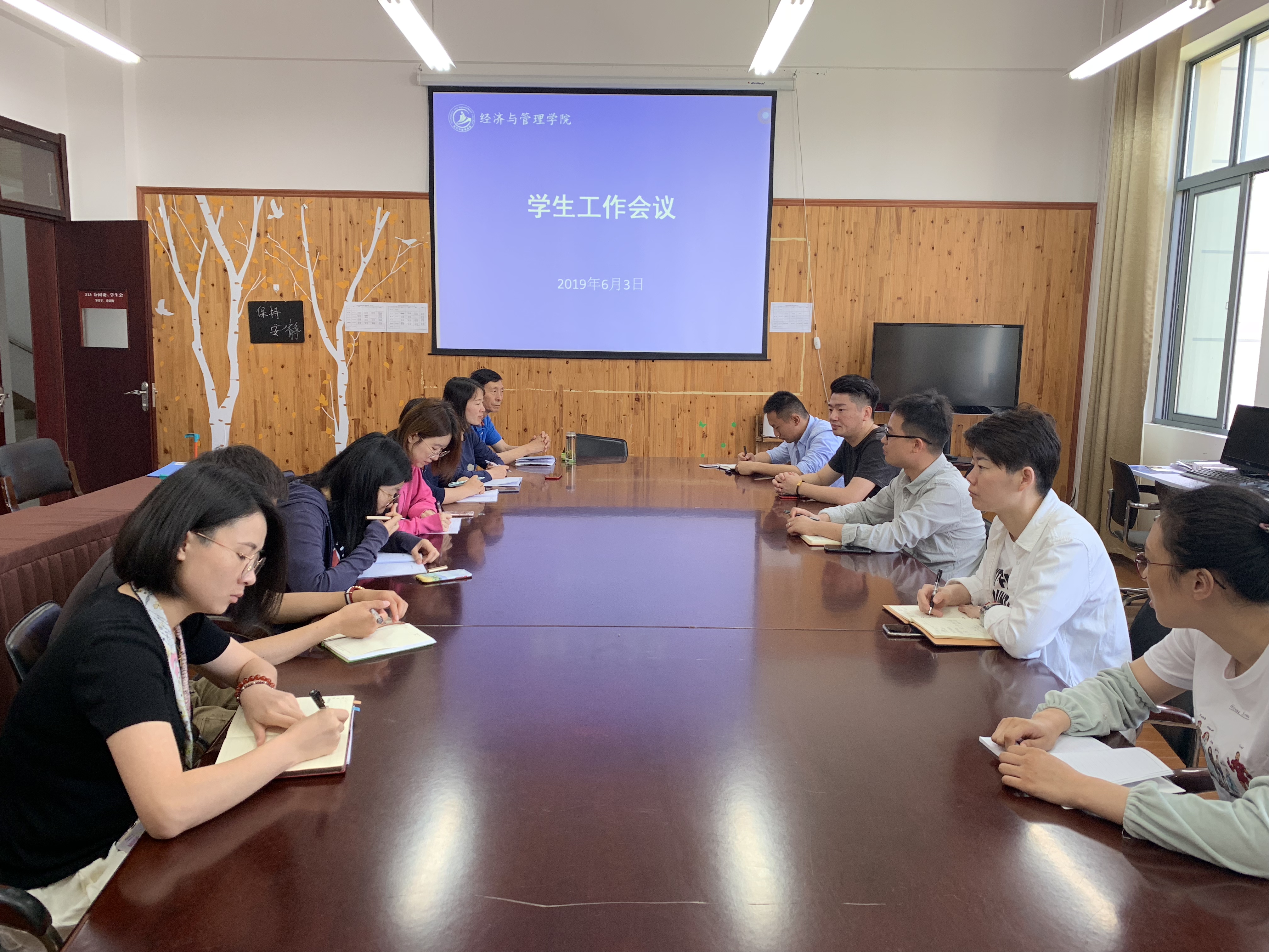六月时节,草木葱茏。为更好的推进学生工作,2019年6月3日上午9:15分,经济与管理学院在3号楼313会议室召开全体辅导员会议。会议由党总支书记石成玉老师主持,副书记郭骏老师及全体辅导员参加。