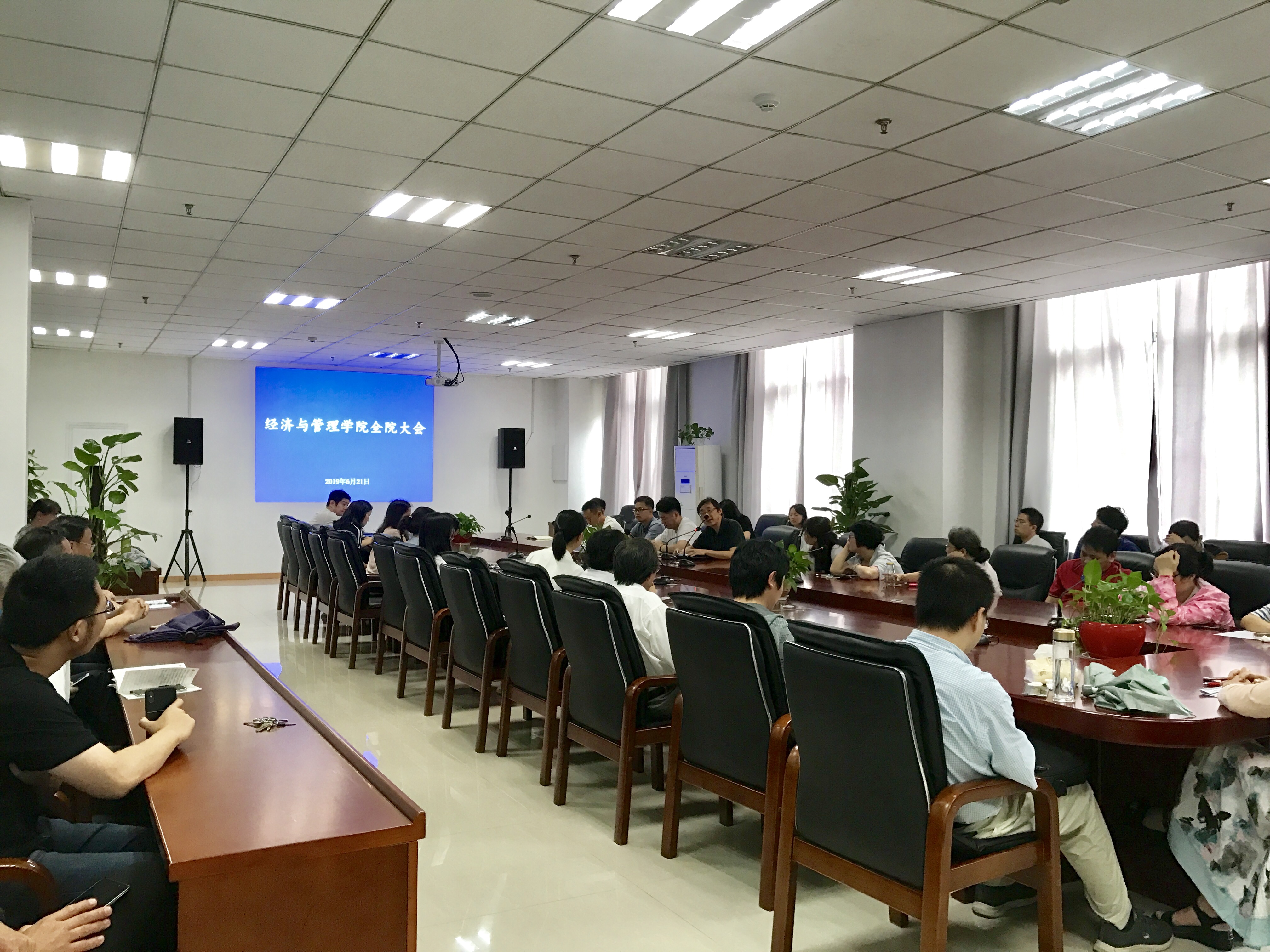 2019年6月21日周五下午一点,经济与管理学院在图文信息楼一楼会议室召开全院大会,部署本学期期末工作。会议由经管学院院长张教授主持,学院全体任课教师和辅导员参会。