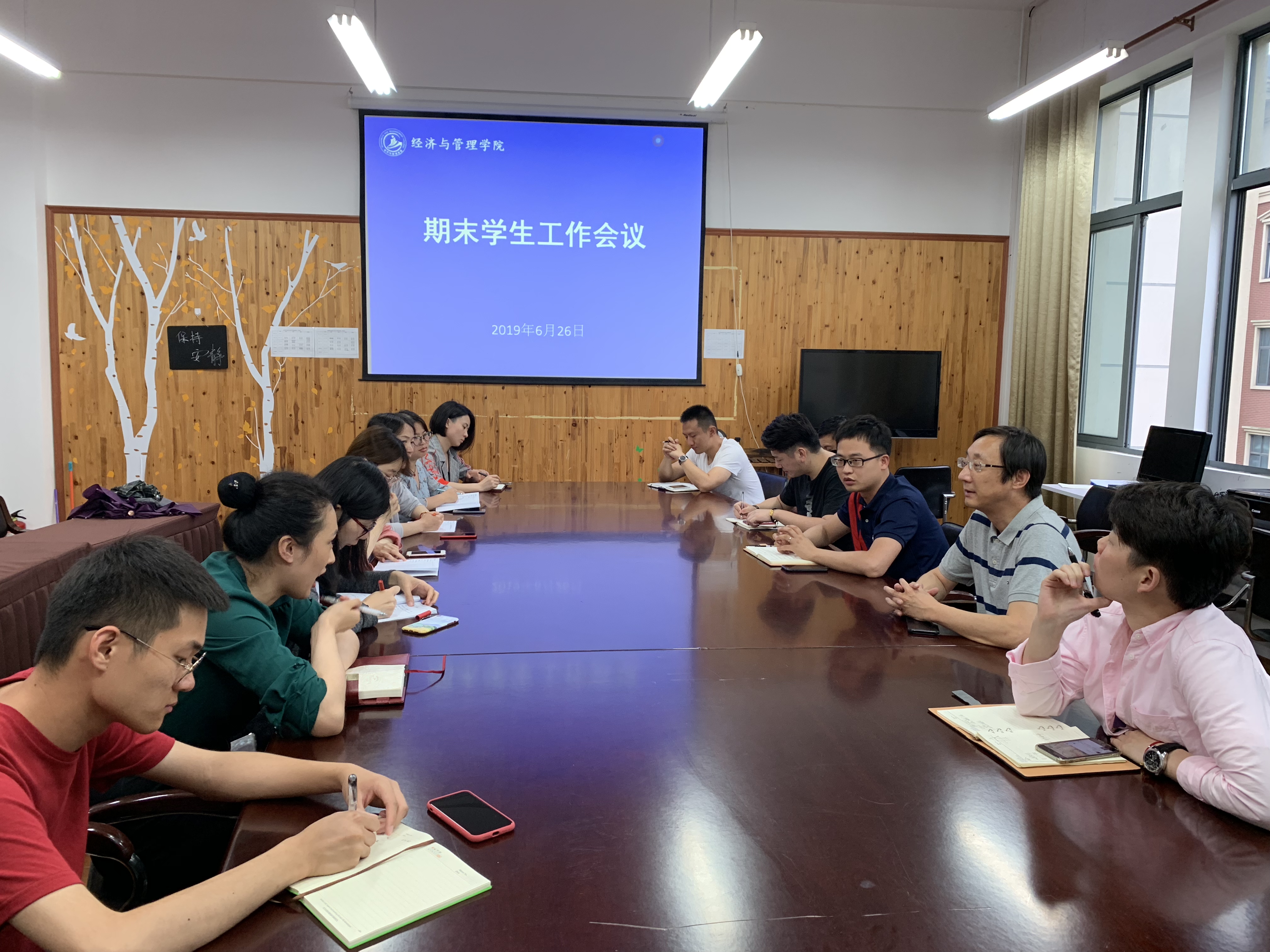 6月26日下午17:15,经济与管理学院召集全体辅导员在3号楼313会议室召开本学期期末学生工作会议,经济与管理学院院长张教授、学院书记石成玉、副书记郭骏以及全体学生工作辅导员参加会议,会议由党总支部书记石成玉主持。